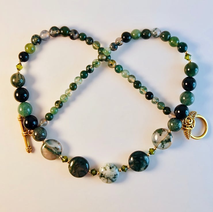The necklace then graduates from 8mm to 6mm and 4mm Moss Agate, brightened with a pair of Swarovski crystals and more gold vermeil, before finishing with a rose toggle clasp.