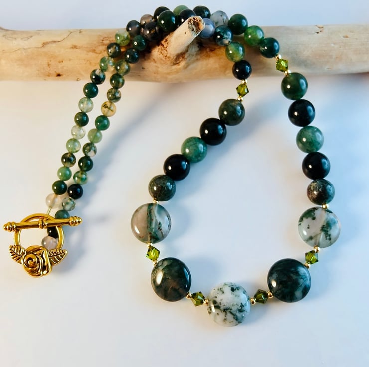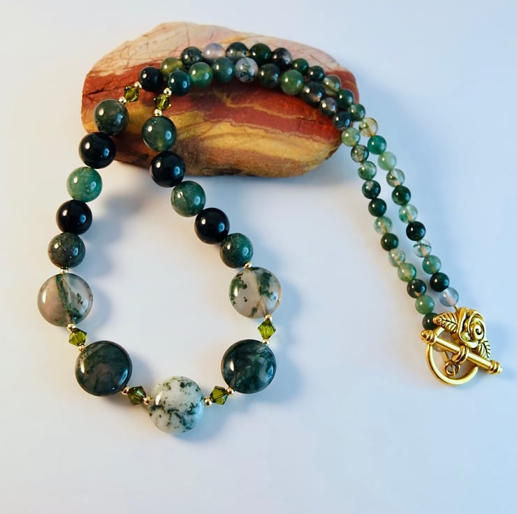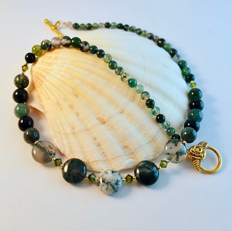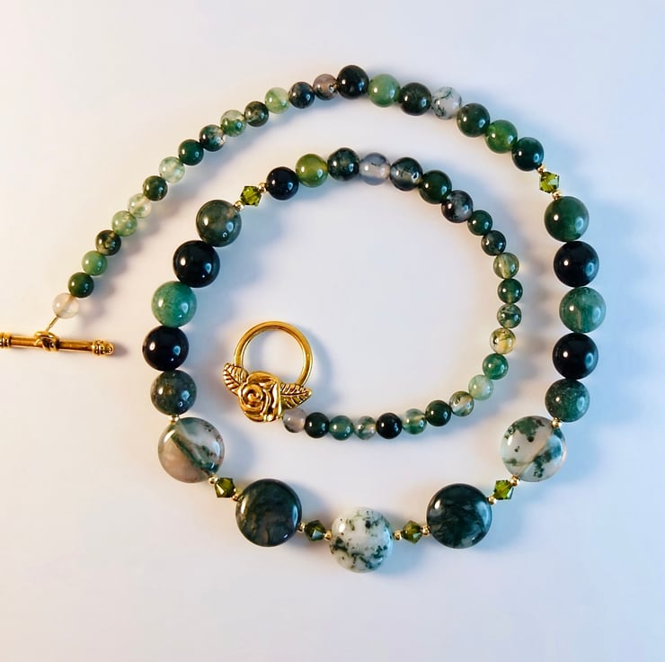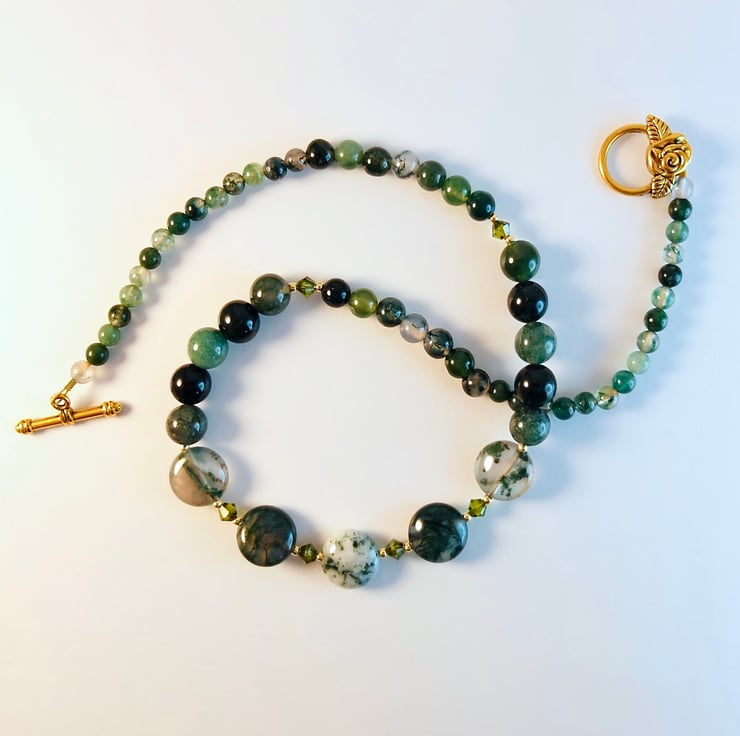 The necklace then graduates from 8mm to 6mm and 4mm Moss Agate, brightened with a pair of Swarovski crystals and more gold vermeil, before finishing with a rose toggle clasp.
