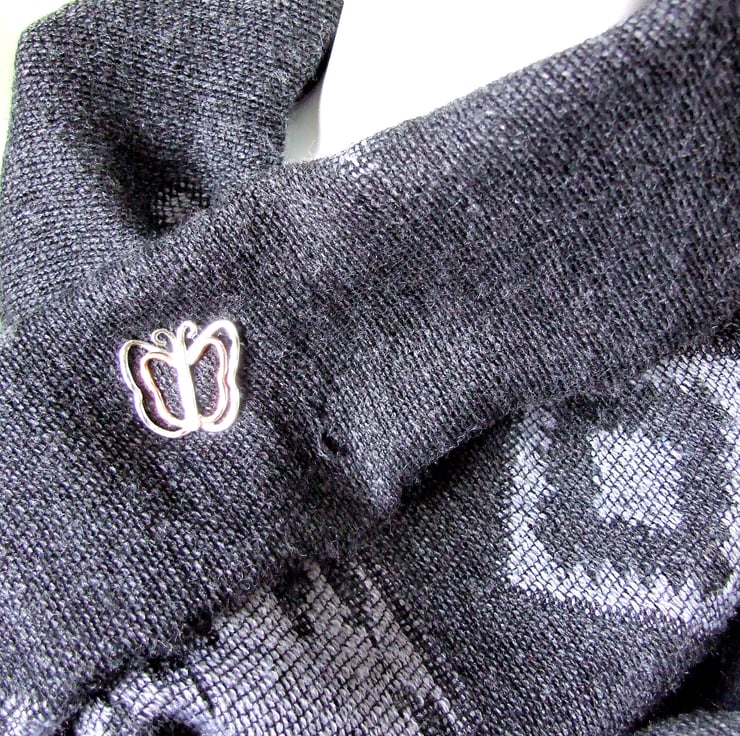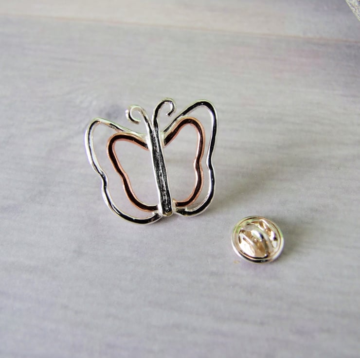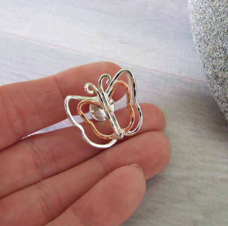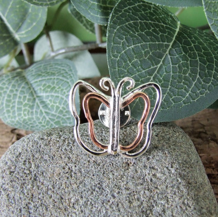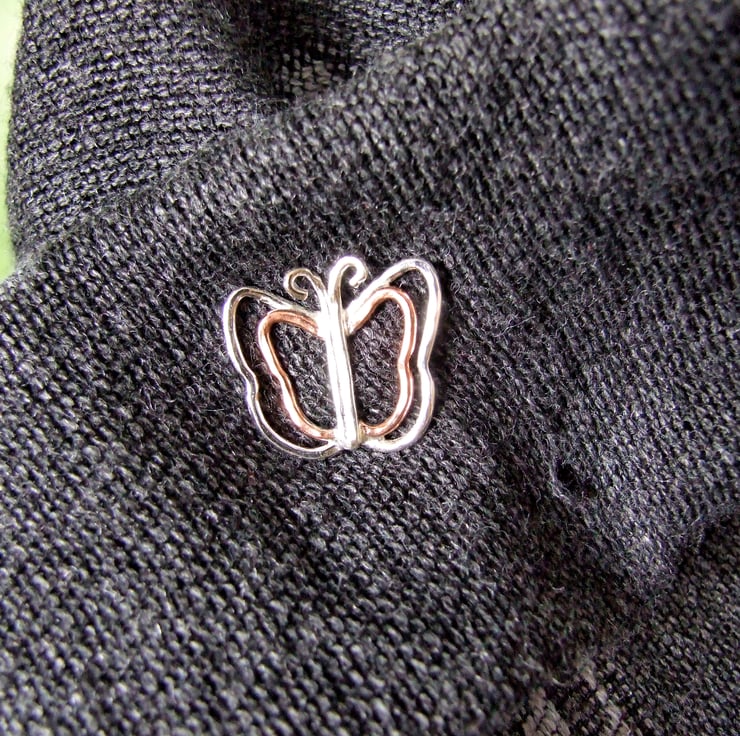 I created this lovely butterfly using copper and recycled sterling silver wire and shaped the putline of the butterfly by hand then soldered together. Soldered to a pin and push back.