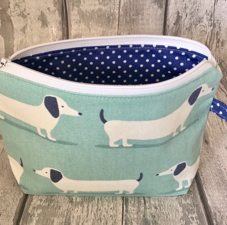 Printed dachshund fabric on a pale blue background & a spotty lining.