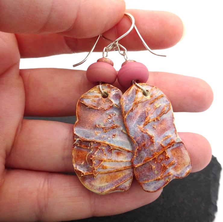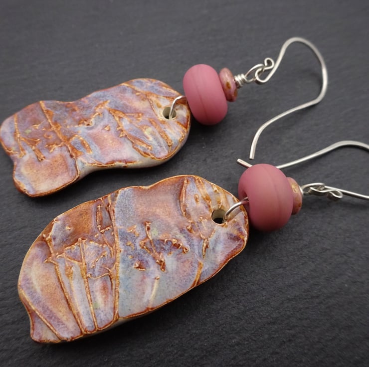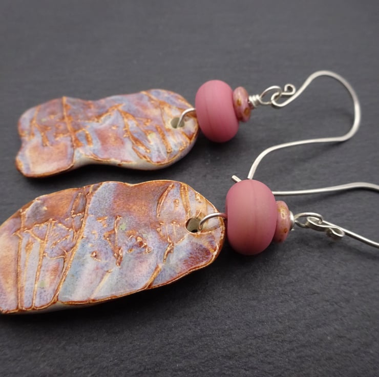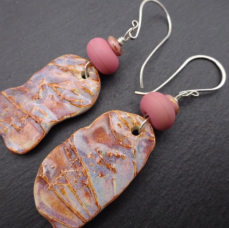A pair of earrings made with handmde sterling silver ear wires, handmade lampwork glass beads and handmade ceramic drops which feature a cow parsley pattern and a pink/ blue glaze.