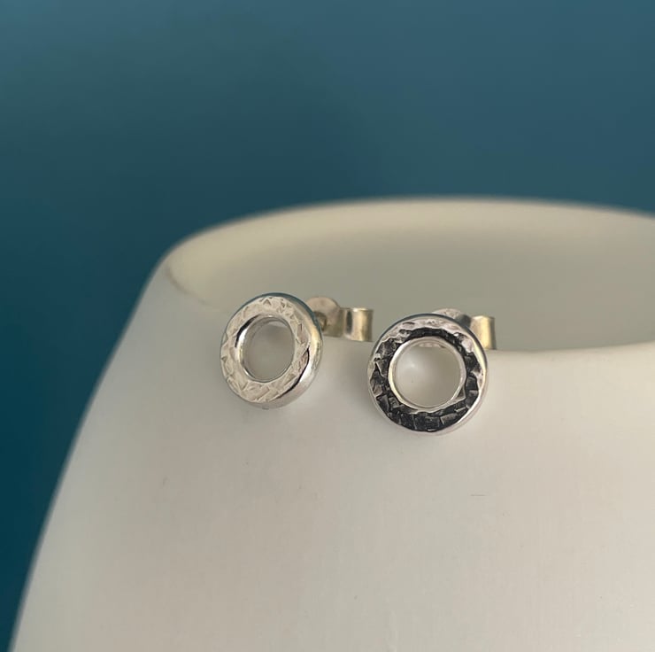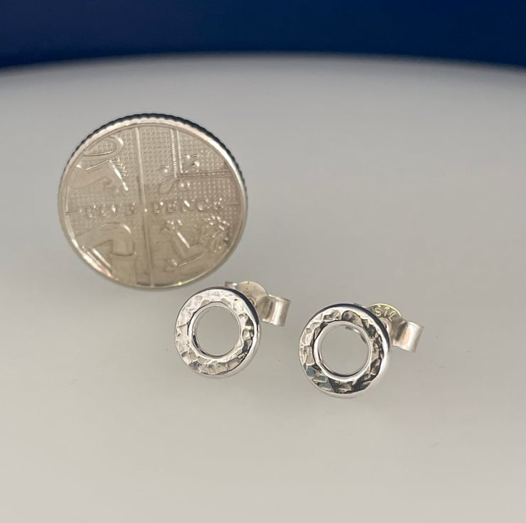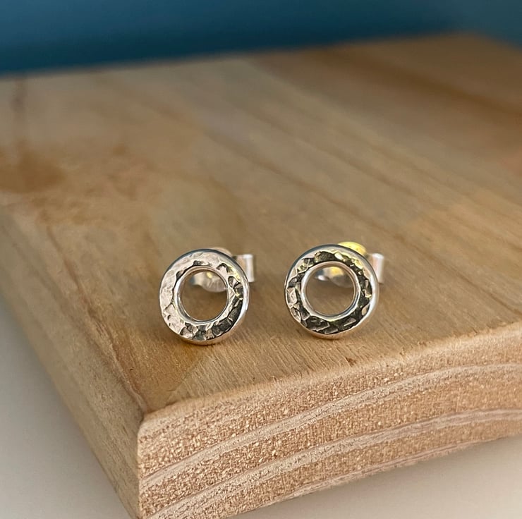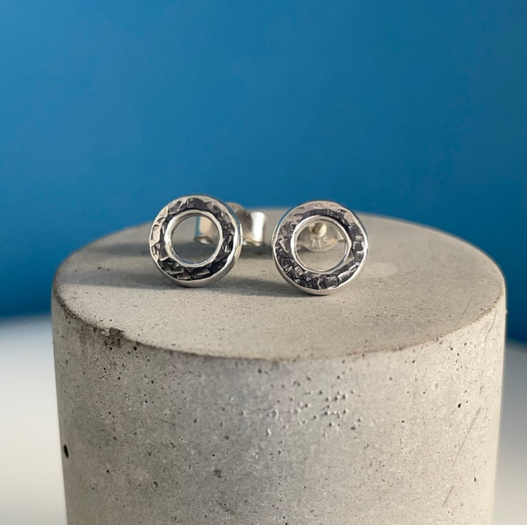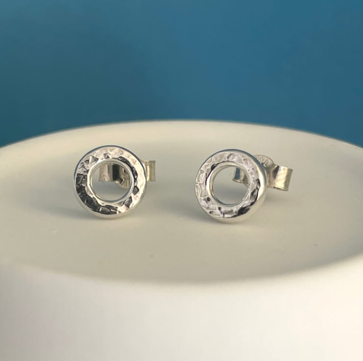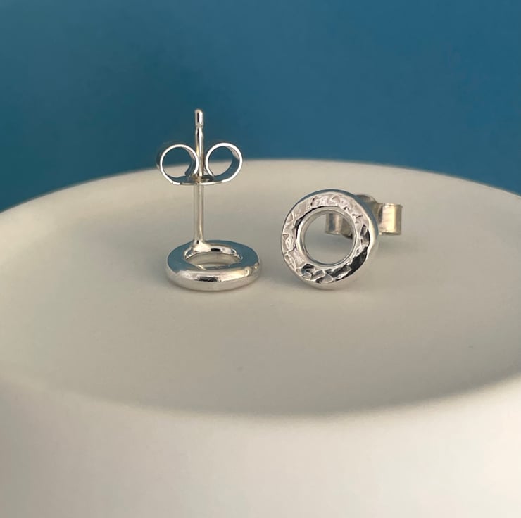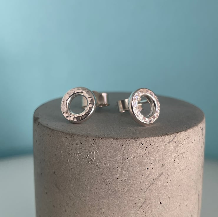A lovely pair of small chunky open circular ear stud earrings handmade from 925 sterling silver. Cut out by hand from solid 1.6mm thick silver round wire, formed into circular shapes then hammered to create an attractive sparkly textured surface. They have long silver pin fittings and secured with stamped (925) silver scroll’s /butterfly's.