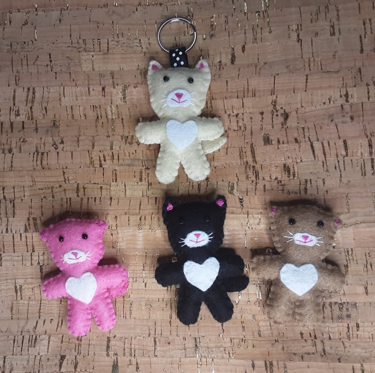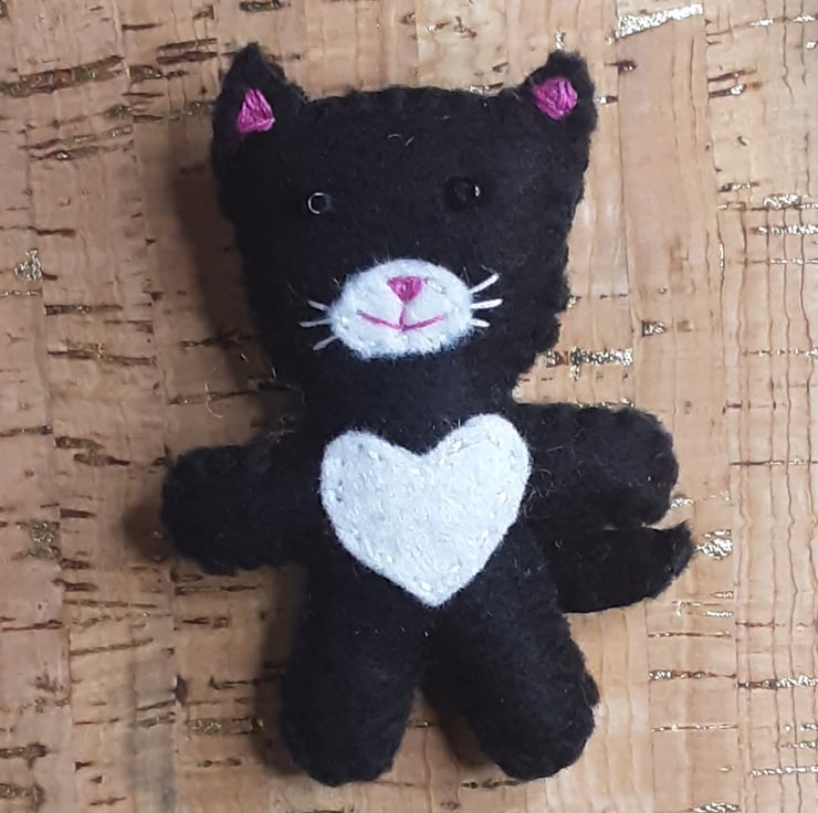The main colours of the cat are black and white. The eyes are made from black seed beads. Mouth & nose are stitched in pink thread. The whiskers are stitched in white thread.