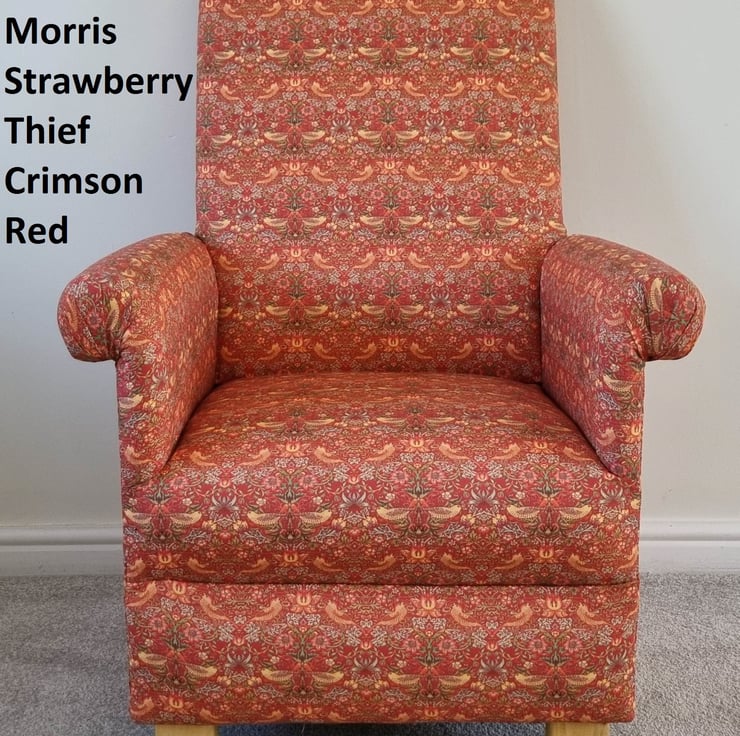 This is a handcrafted, sturdy adult sized armchair, which has been made by myself, a professional upholsterer with over 32 years experience, using William Morris Strawberry Thief Crimson Red fabric.