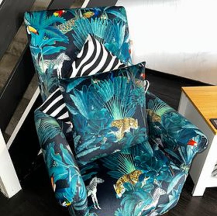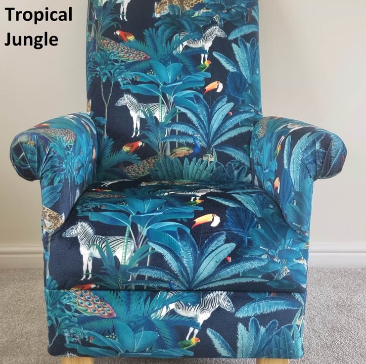 This is a handcrafted, sturdy adult sized armchair, which has been made by myself, a professional upholsterer with over 32 years experience, using Tropical Jungle Animals Velvet fabric.
