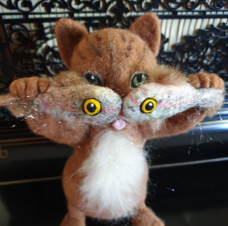 A sculpture needlefelted from wool of a comedy cat holding two fish up to his eyes. Around 45 cm in height. Fish can be removed and the cat has eyes behind the fish! He is freestanding and can be sligthly adjusted.