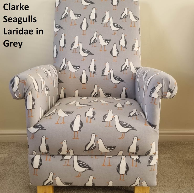 This is a handcrafted, sturdy adult sized armchair, which has been made by myself, a professional upholsterer with over 32 years experience, using Clarke & Clarke Seagulls Laridae in Grey fabric.