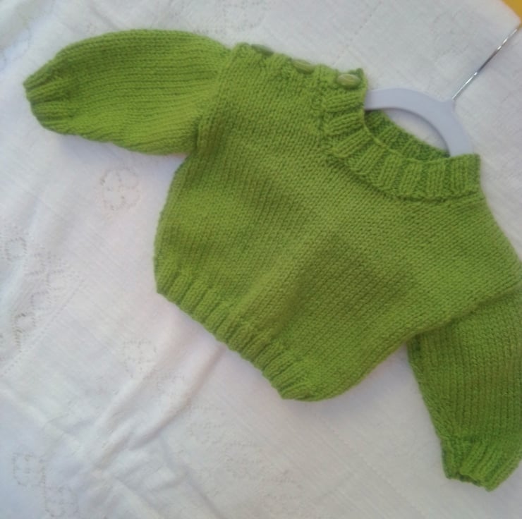 A classic outfit for baby comprising a round neck jumper and hat. Every baby needs a collection of jumpers and cardigans in their wardrobe. It is hand knitted with care & love in a smoke & pet free home by myself. It is also available to be made in a premature size to fit a baby approx 3 lbs - 5 lbs in weight.