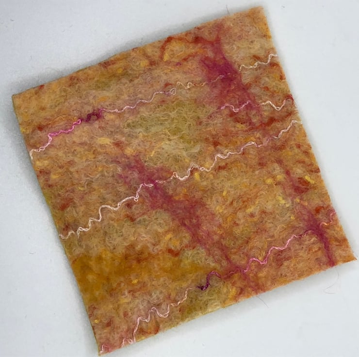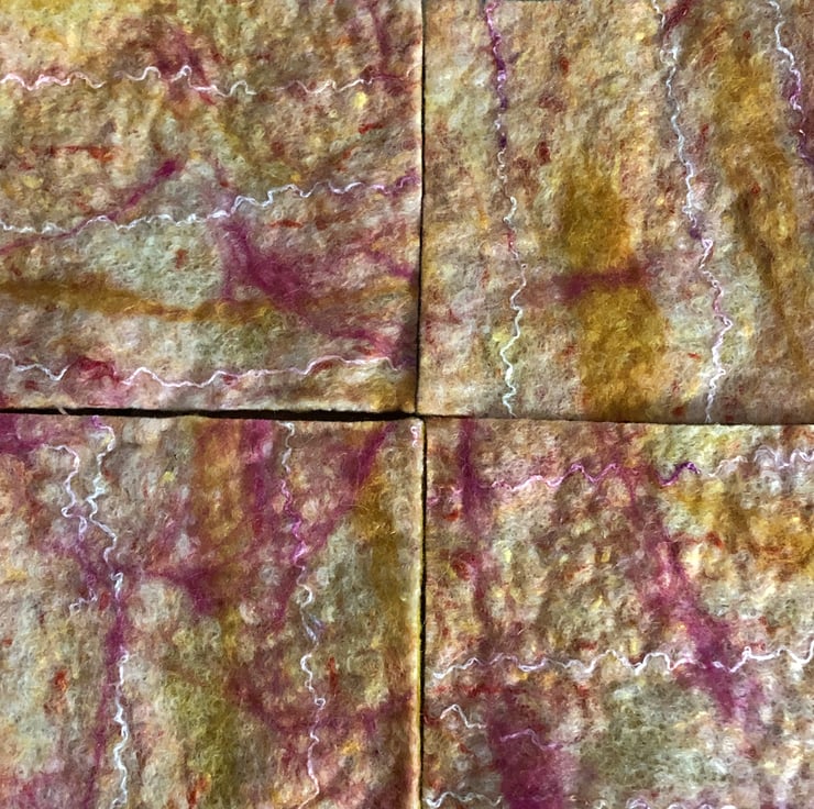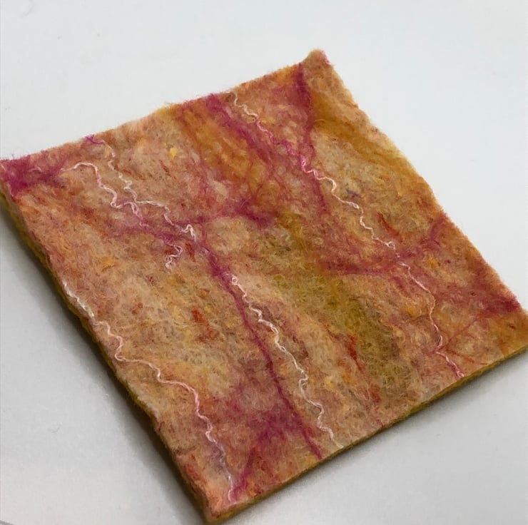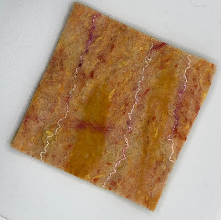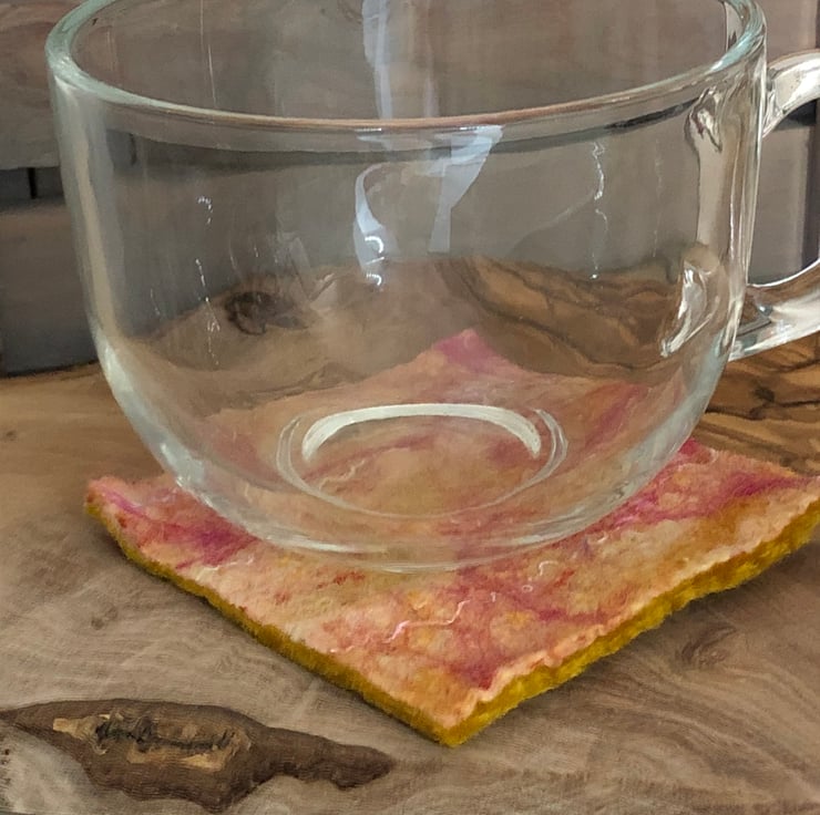 Four unique wool felted coasters in the colours of the sunset. Each coaster is unique, made from wool and silk, with strands of handdyed yarn, in rich, vibrant peaches, pinks and golds. Each coaster is approximately 9cm/3.5" square.