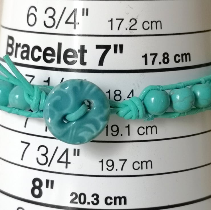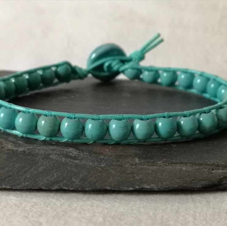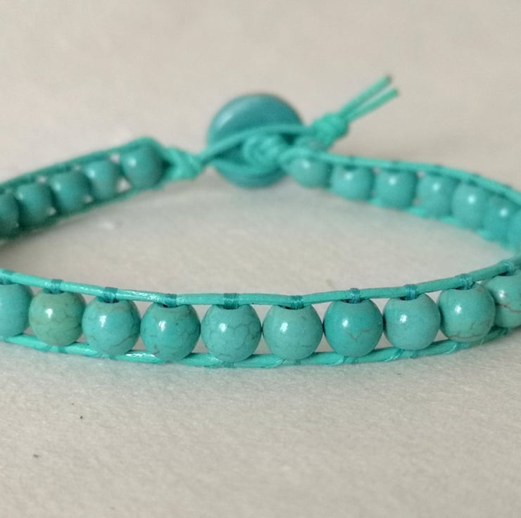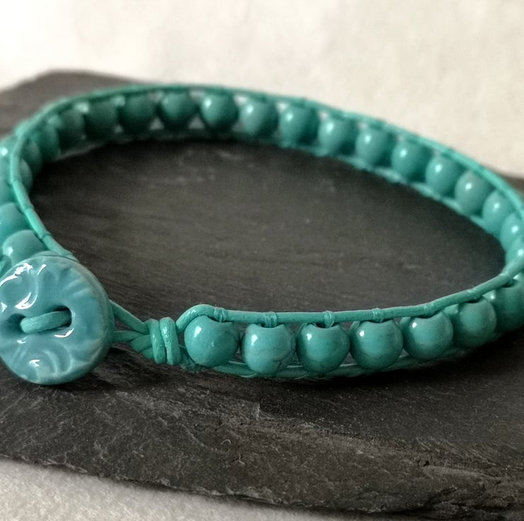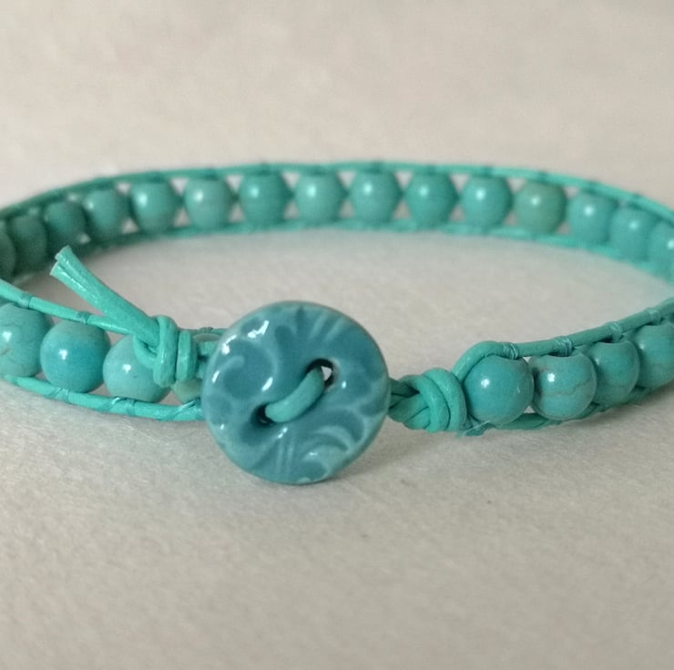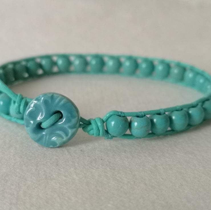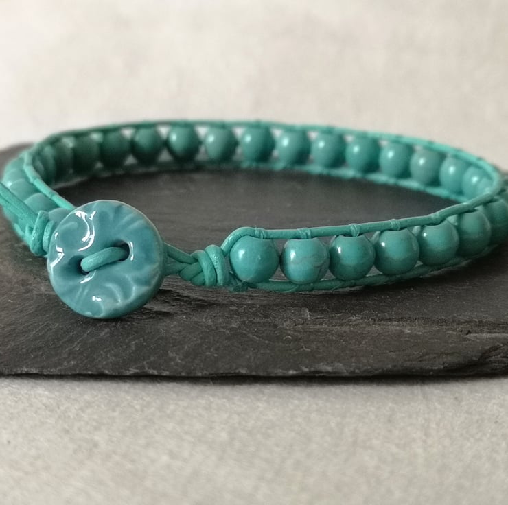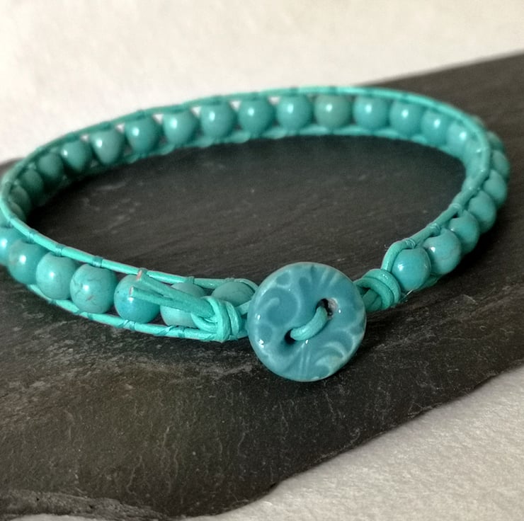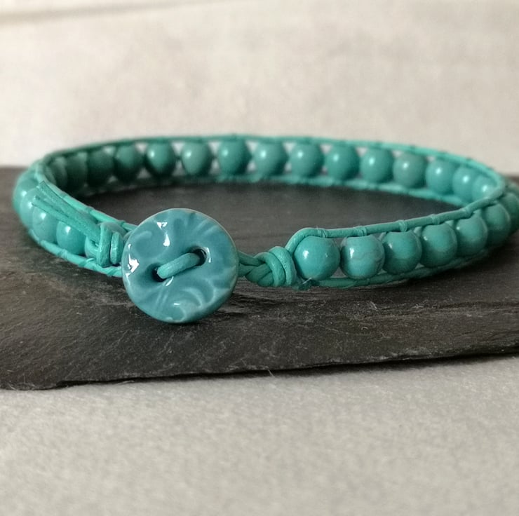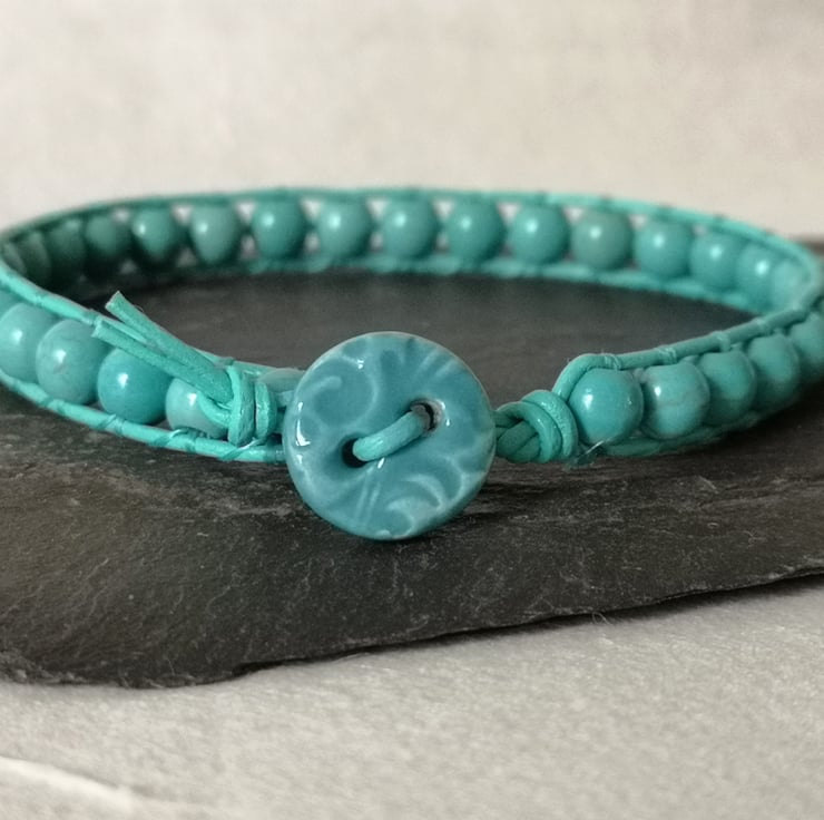 This simple bracelet features turquoise gemstone beads which are said to bring luck, peace and protection. It is also one of the birthstones associated with December. They've been attached to soft leather cord of the same colour, and a small ceramic button has been used as a fastener.