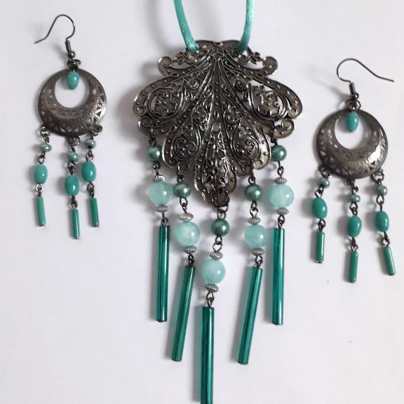 To the buckle I have added 5 dangles, each made up with turquoise glass tubes, turquoise jade beads with silver plated lice beads to each side and glass pearls, the tubes and pearls are reclaimed.