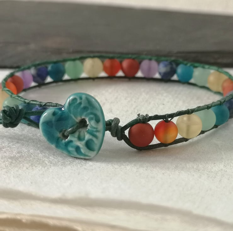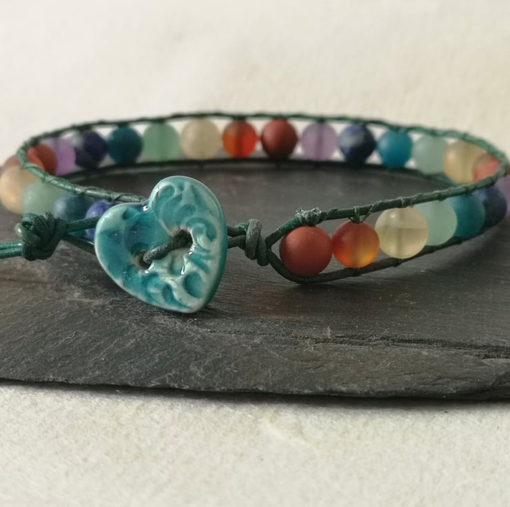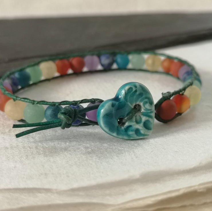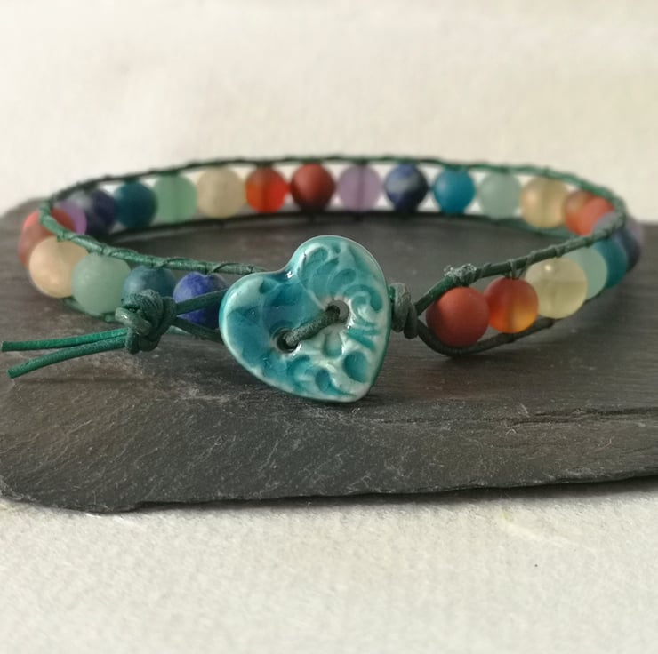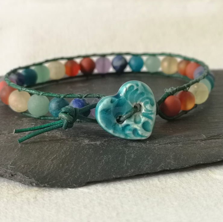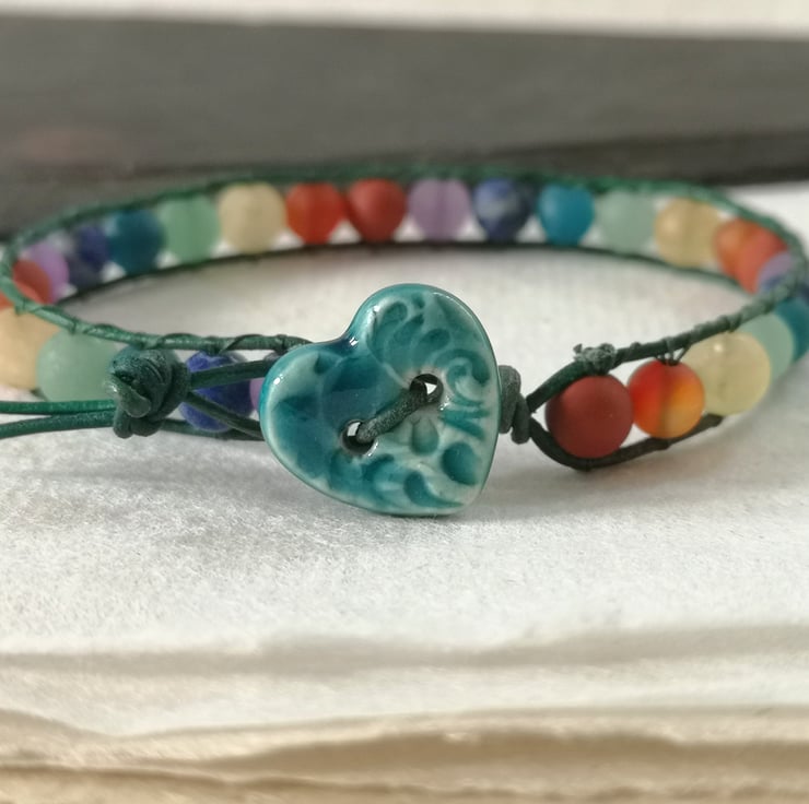 They've been attached to a dark teal genuine leather cord and a heart-shaped ceramic bead has been used as a fastener.