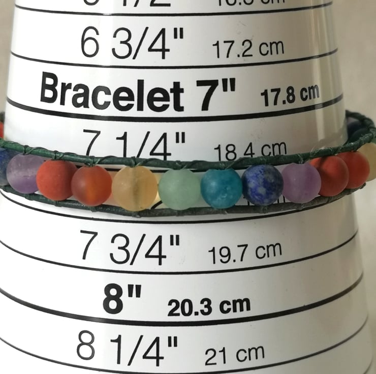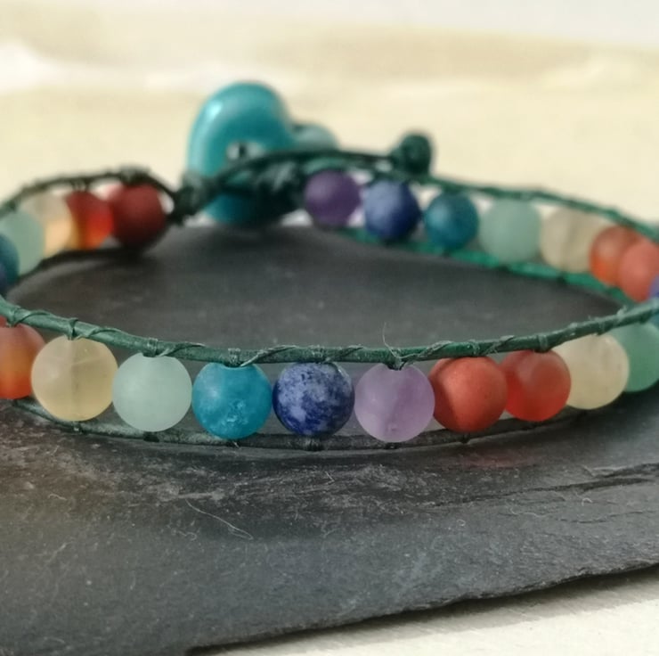 This colourful bracelet features seven different semi precious gemstone beads to represent each of the seven chakras.