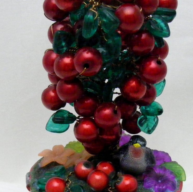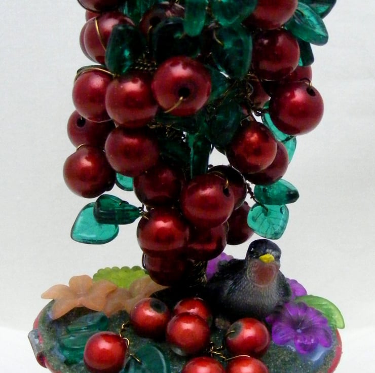 I've used a 50x60 mm red metal bucket and glued green oasis and the tree inside the bucket. A layer of green sand is glued on top of the oasis. Top of the bucket is decorated with, 15mm purple lucite flowers,17mm salmon lucite flowers,15x12 mm green lucite leaves, 8mm red miracle beads and a 40x20mm resin blackbird. These are also glued on top of the bucket.
