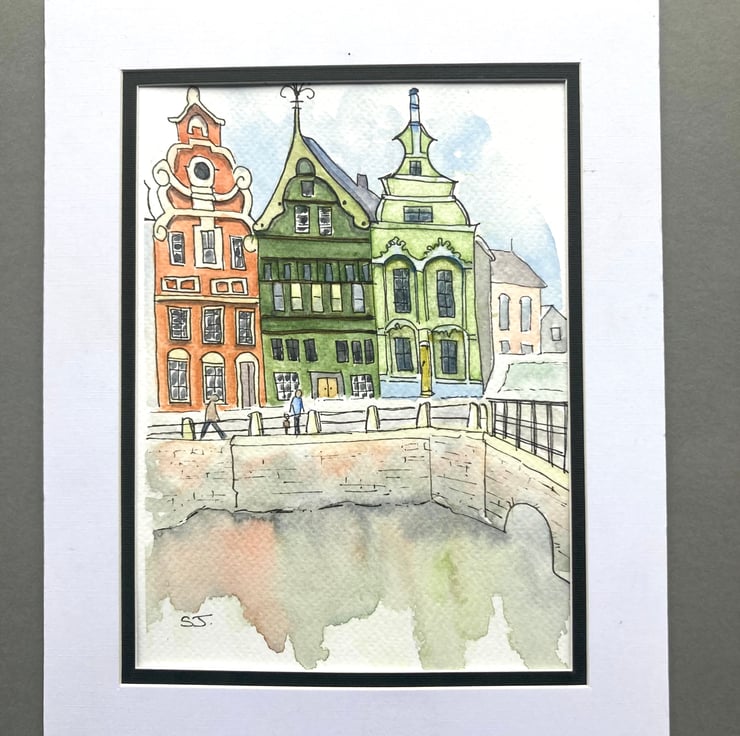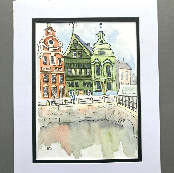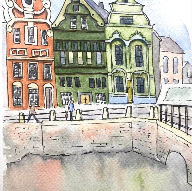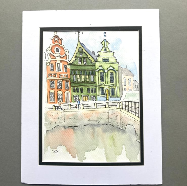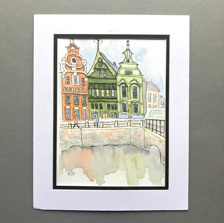 Original A5 watercolour of houses on Haverwerf ( Oat Yard ) Mechelen Belgium