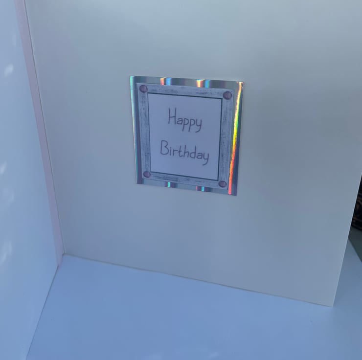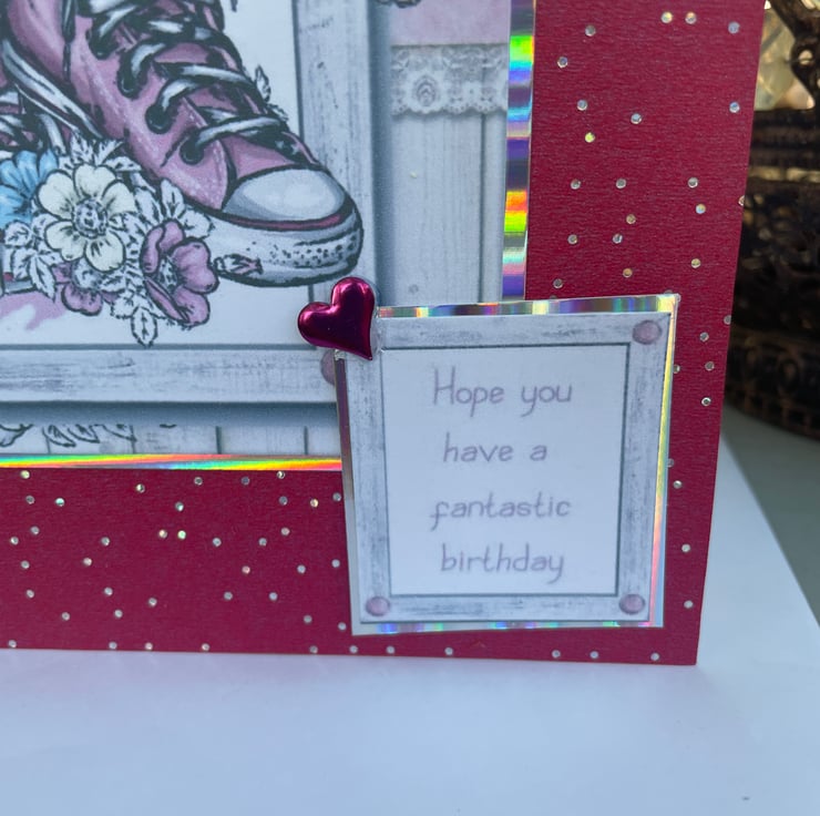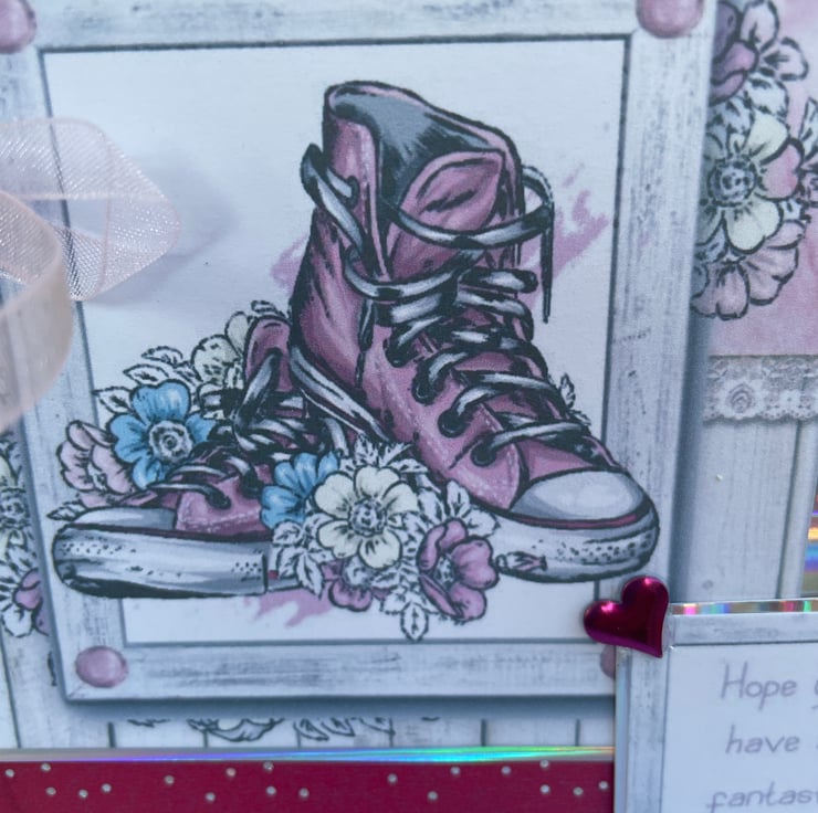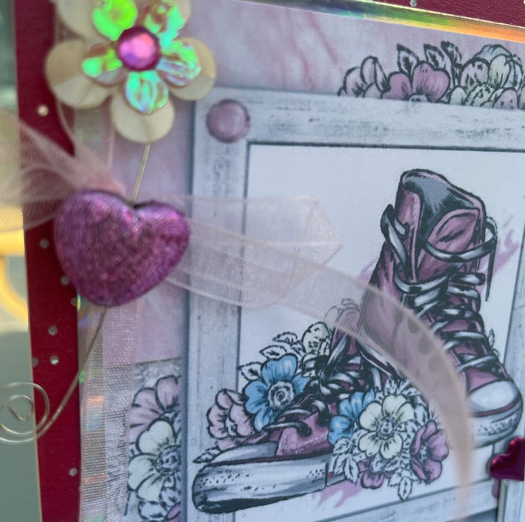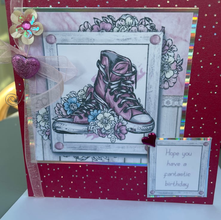 A pretty pink card for a young lady. This 13x13cm card is a beautiful pink extravaganza. The main design is a pair of pink baseball boots and flowers. This is mounted on silver rainbow mirror card. The design is on top of dark pink pearlised card with silver holographic dots. The greeting is Hope you have a fantastic birthday. The design is embellished with pale pink organza ribbon and 2 hearts, one pink metal and the other is pink glitter, wire and a flower. Inside the card is the greeting Happy birthday. A lovely card for a young girl.