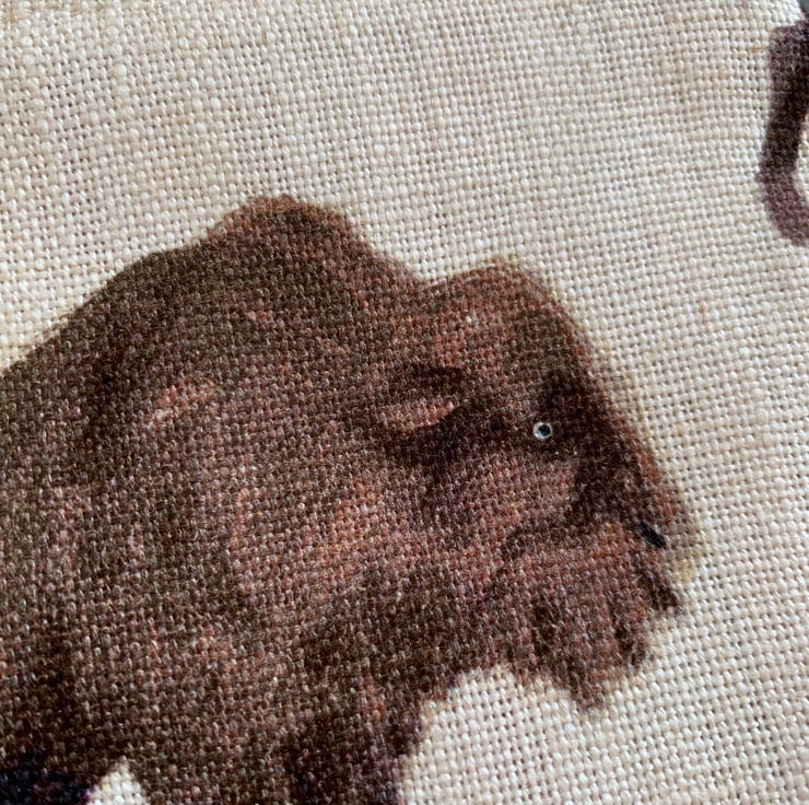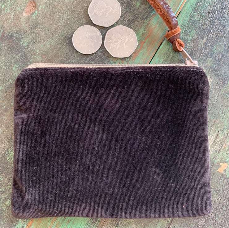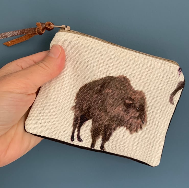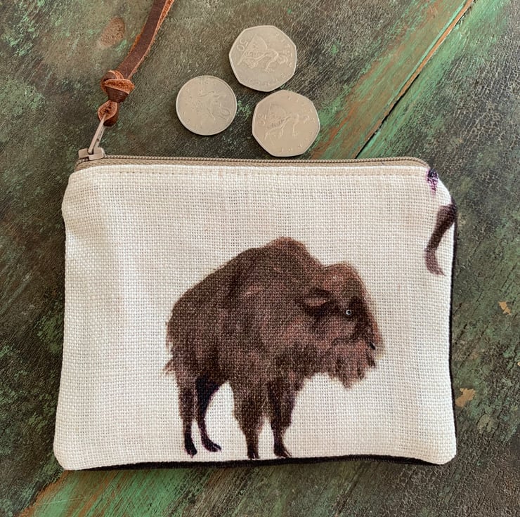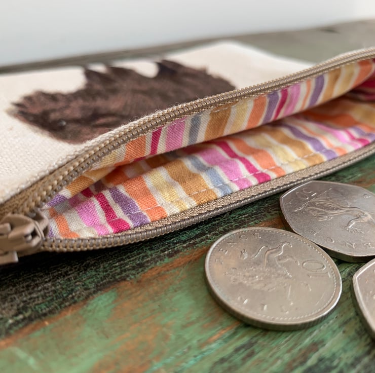 Cute little coin purse made from an offcut of linen-mix fabric with a bison print and dark brown velvet It is lined with candy striped cotton.