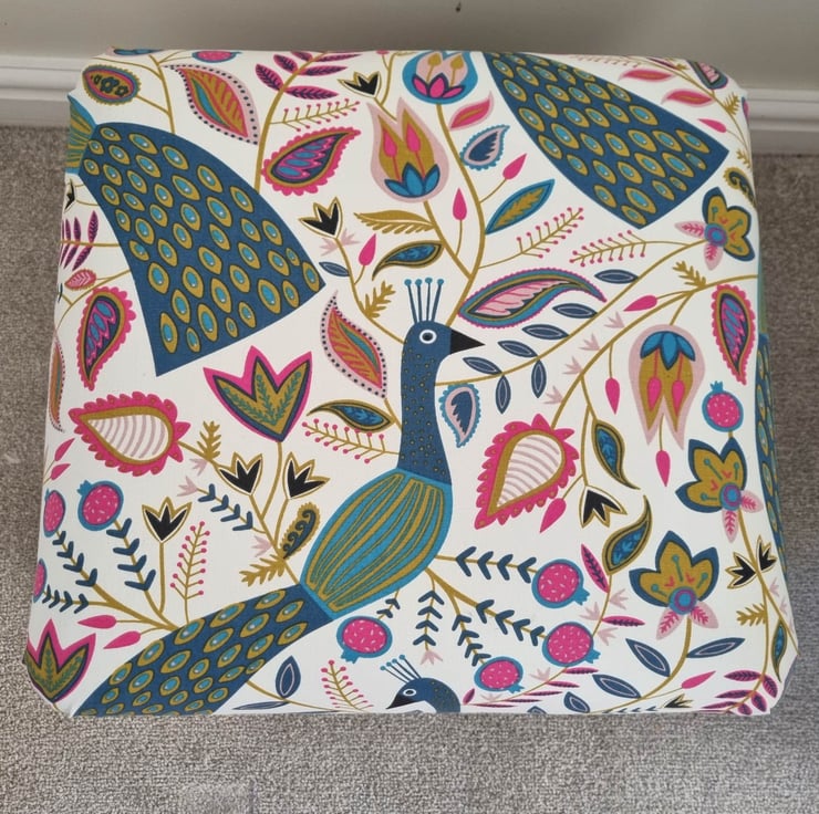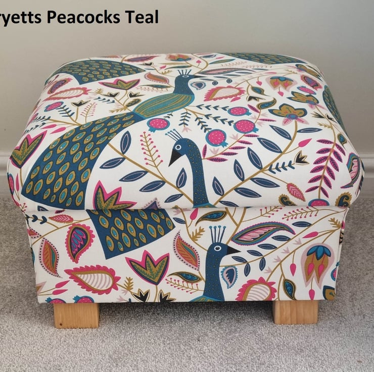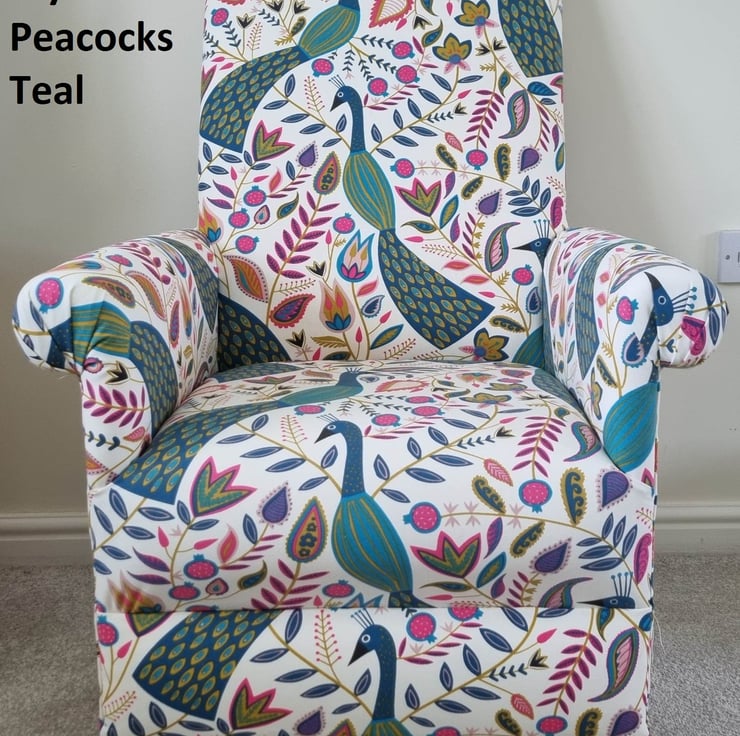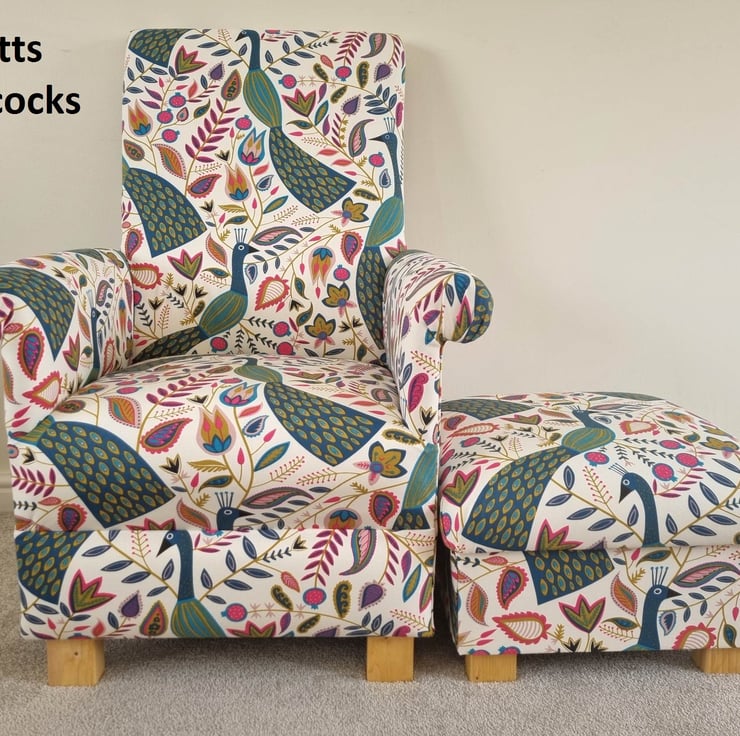 This is a handcrafted, sturdy Adult chair & footstool, which has been made by myself, a professional upholsterer with over 32 years experience, using this lovely Fryetts Peacocks Teal fabric, and also includes a matching footstool.