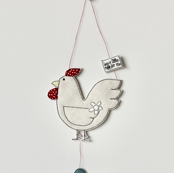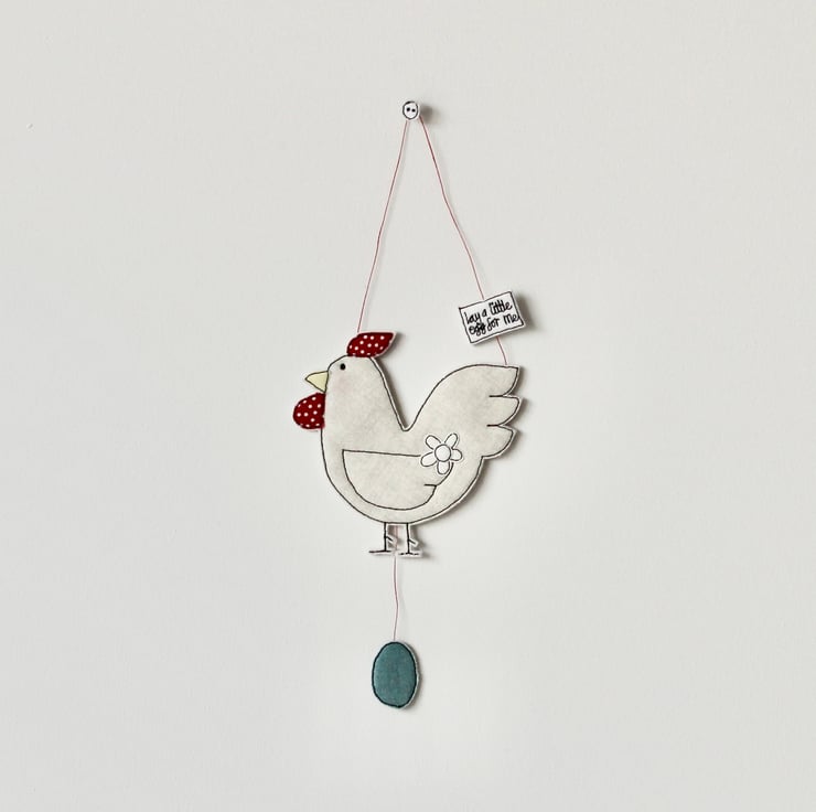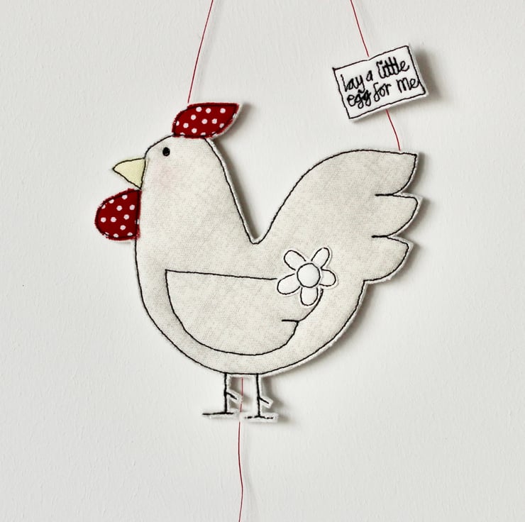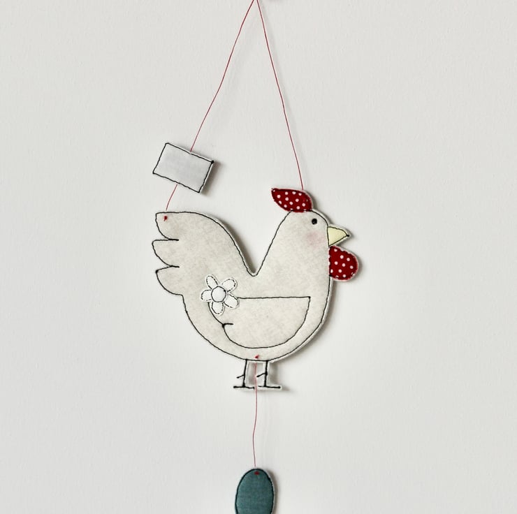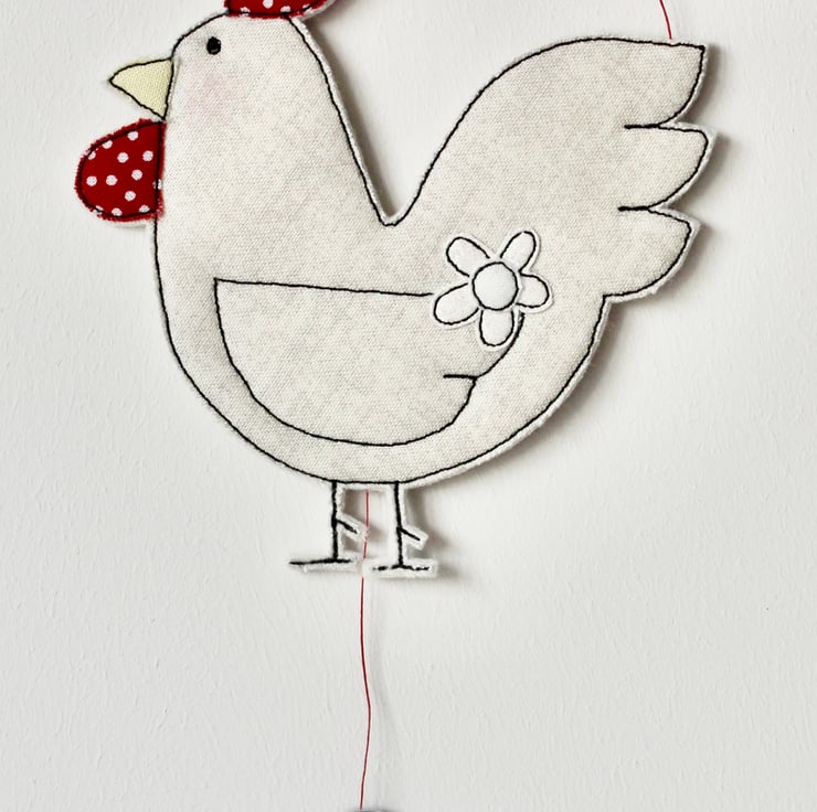 Chicken is created using freehand machine embroidery and multiple layers of cotton cloth, glitter fabric and 100% wool felt. Cut out by hand using very sharp scissors with a linen thread to suspend.
