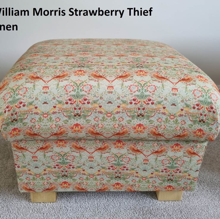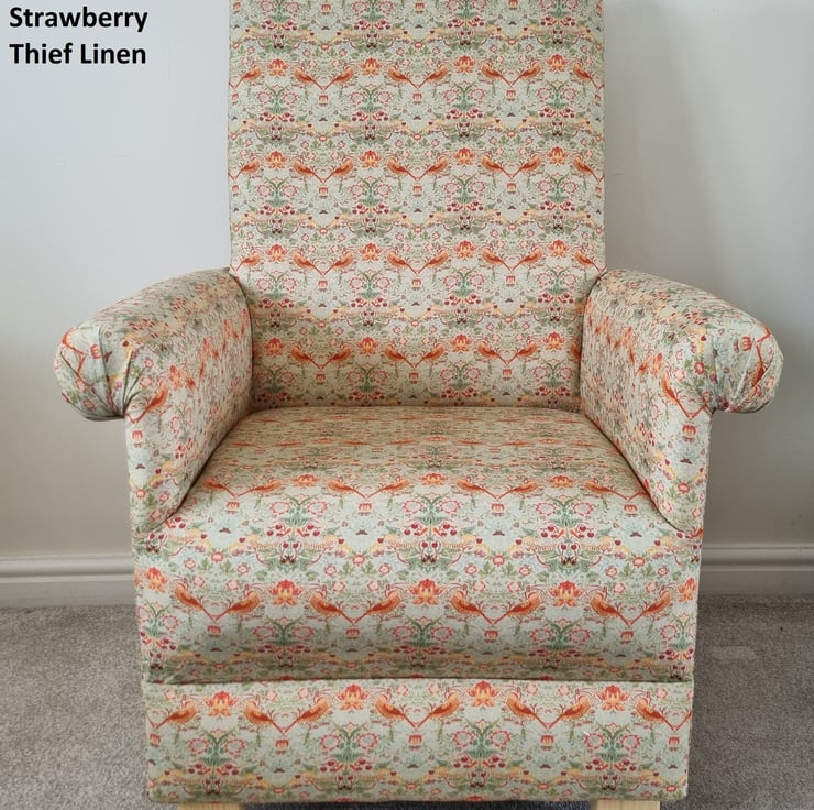 This is a handcrafted, sturdy Adult chair & footstool, which has been made by myself, a professional upholsterer with over 32 years experience, using this charming William Morris Strawberry Thief Linen fabric, and also includes a matching footstool.