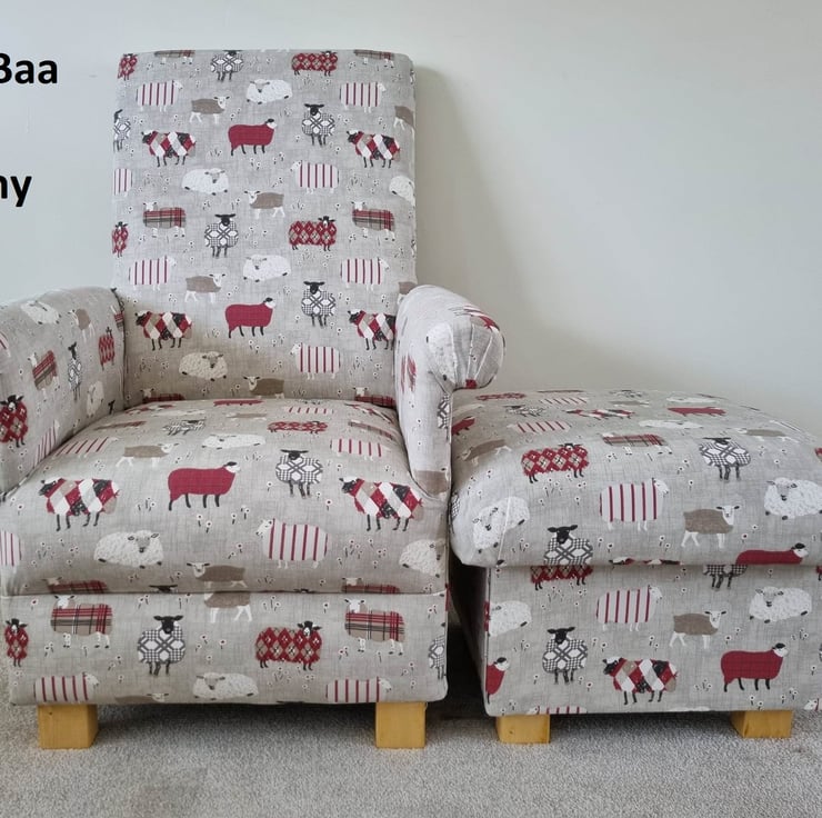 This is a handcrafted, sturdy Adult chair & footstool, which has been made by myself, a professional upholsterer with over 32 years experience, using this lovely iliv Baa Baa Sheep Red fabric, and also includes a matching footstool.