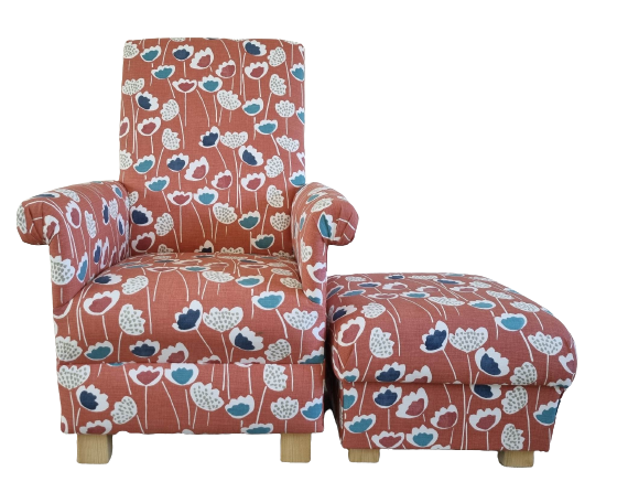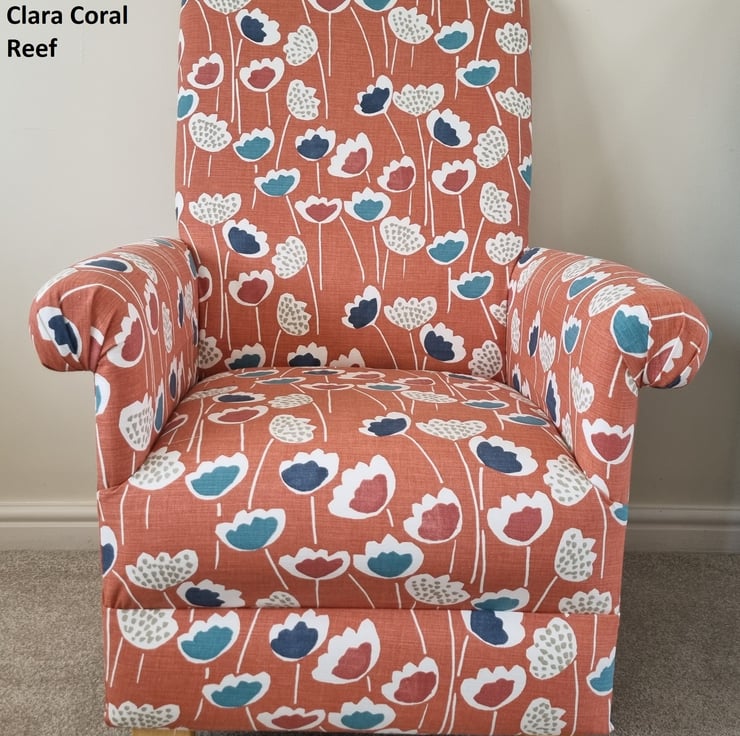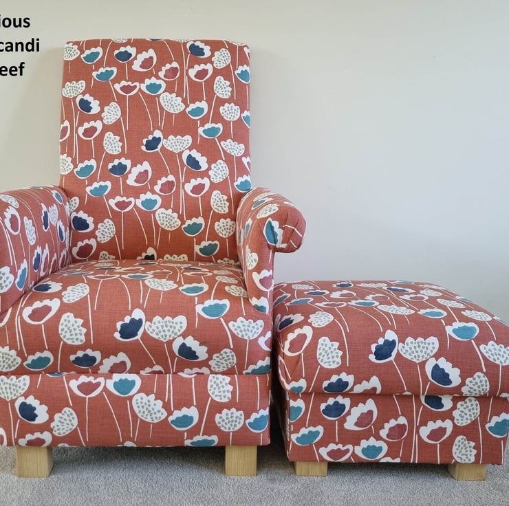 This is a handcrafted, sturdy Adult chair & footstool, which has been made by myself, a professional upholsterer with over 32 years experience, using this lovely Prestigious Clara Coral Reef fabric, and also includes a matching footstool.