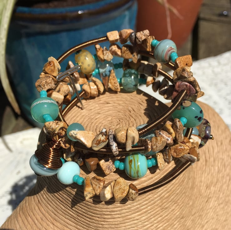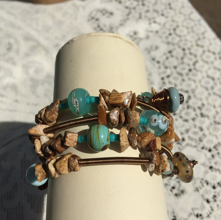 Four wrap Bracelet with Lampwork beads, Picture Jasper chips, two stone beads & copper wire & seed beads, all on a memory wire base.
