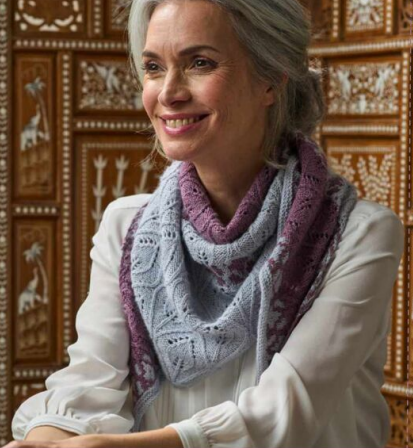 Full downloadable pdf instructions for this delicate, wide triangular shawl. The shawl is worked back and forth in a lace pattern from the bottom point up. Three bands of feminine mosaic (slip stitch) flowers are incorporated to break up the solid areas of colour. The shawl is finished off with a few rows of garter stitch before an i-cord cast-off. Sandra’s design is knitted in Exquisite 4ply, a beautifully silky and luxurious yarn from West Yorkshire Spinners. Other 4 ply yarns can be used for this stunning shawl.