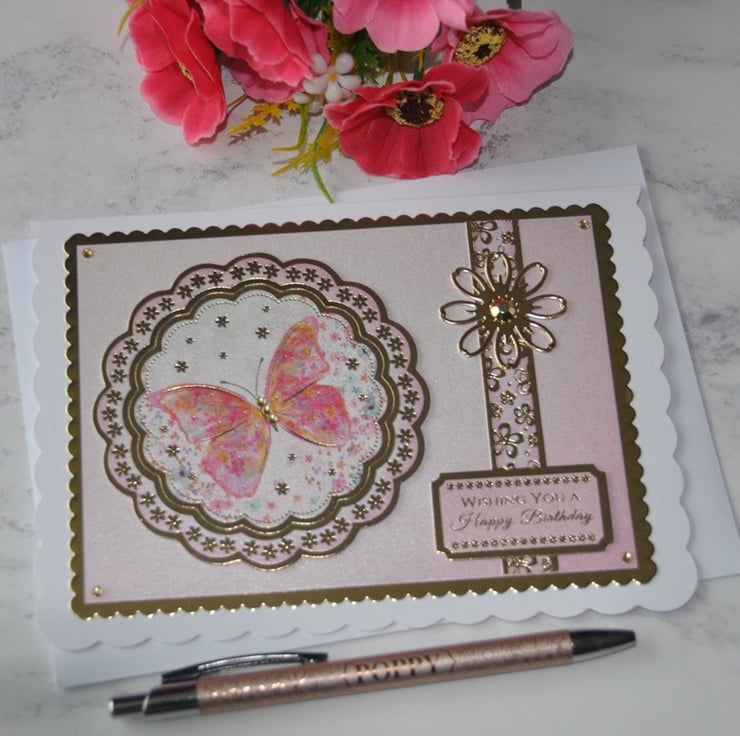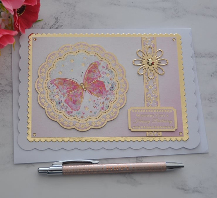 This design is a painted pink butterfly with gold accents. It is surrounded by gold foiled flowers. The sentiment greeting is 3D and gold foiled and says Wishing You A Happy Birthday. Gems, a 3D gold flower, and lots of gold foiling finish the card.