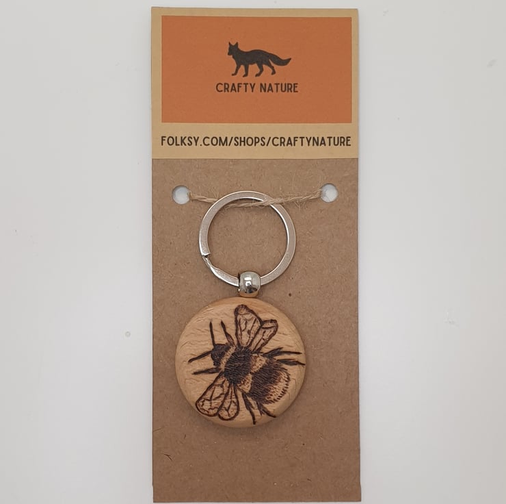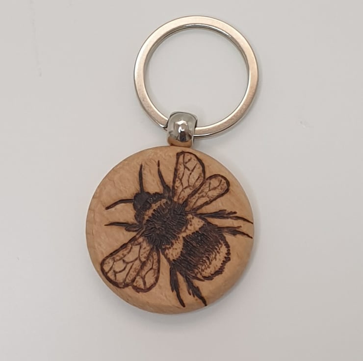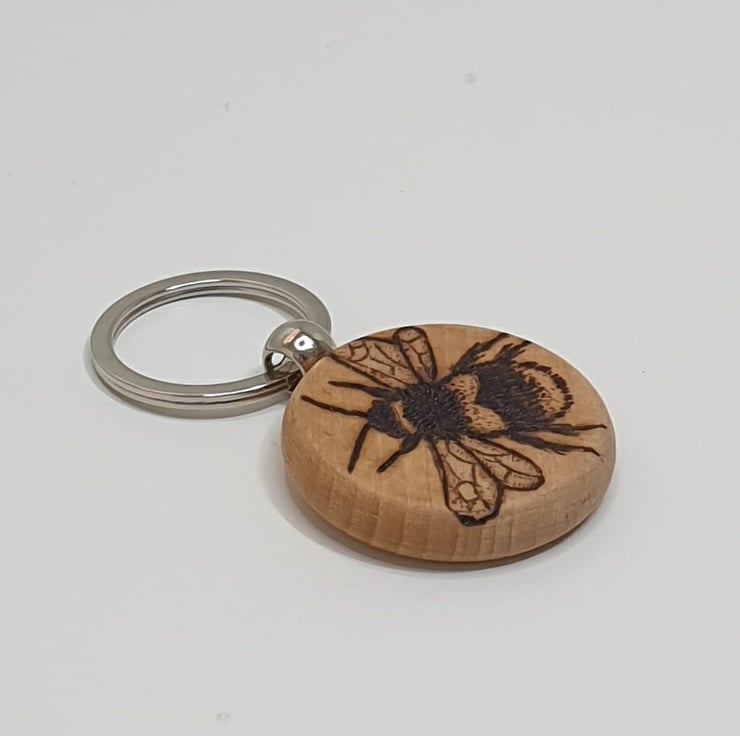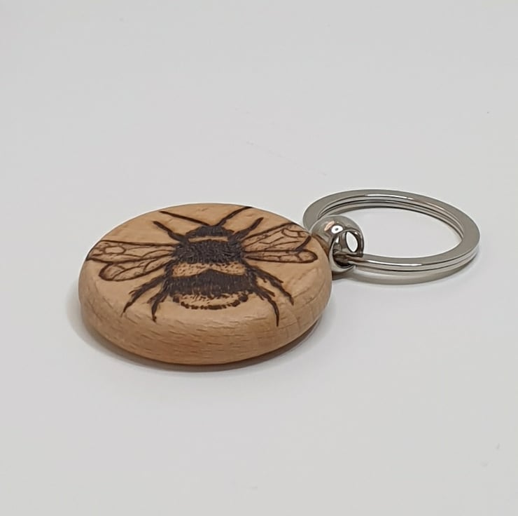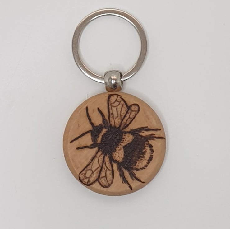 Lovely wooden keyring which has been handburnt with a bumblebee on one side using the art of pyrography and would make a useful unisex gift for a bee lover.