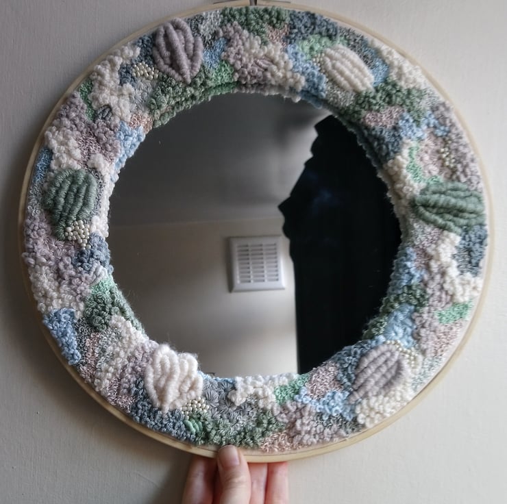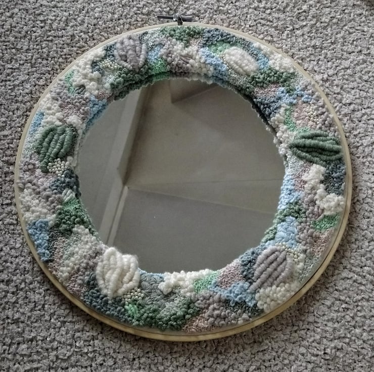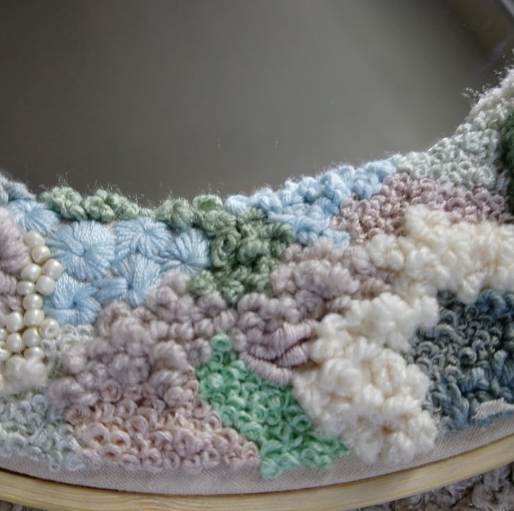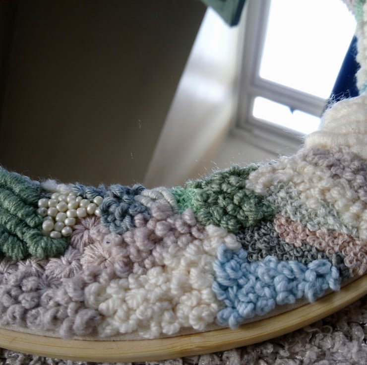 The gazing pool a 12 inch one of a kind hand embroidered mirror. Embroidery thread, yarn and beads have been hand sewn onto a light cream fabric in an abstract pattern surrounding a mirror plate creating a piece which is both eye catching and unique. A perfect addition to any home