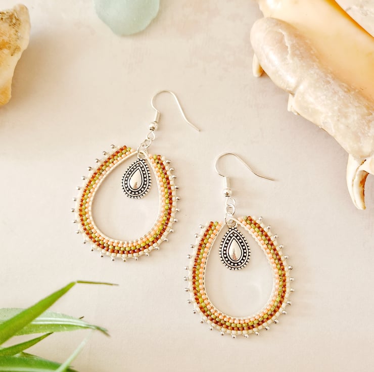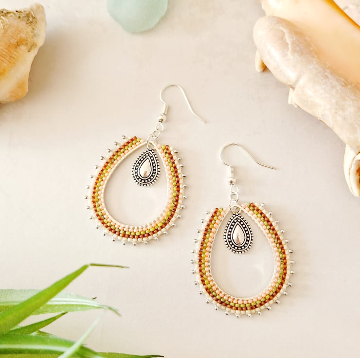 Hand-sewn using shimmering pale salmon pink, green, topaz and cream abalone glass Miyuki beads, these elegant boho earrings are perfect for lovers of organic shades. At 2mm in size, the tiny beads also make them extremely lightweight - ideal if you're wanting to accessorise comfortably on your hols.