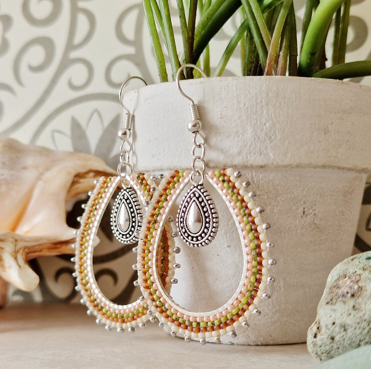 Exude Bohemian elegance with a little help from our hand-woven, cream beaded boho teardrop earrings.