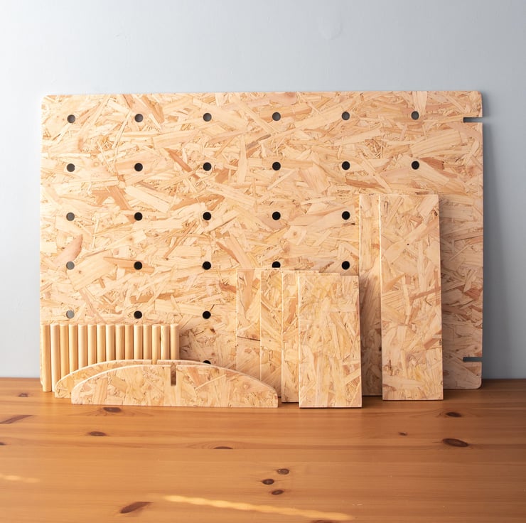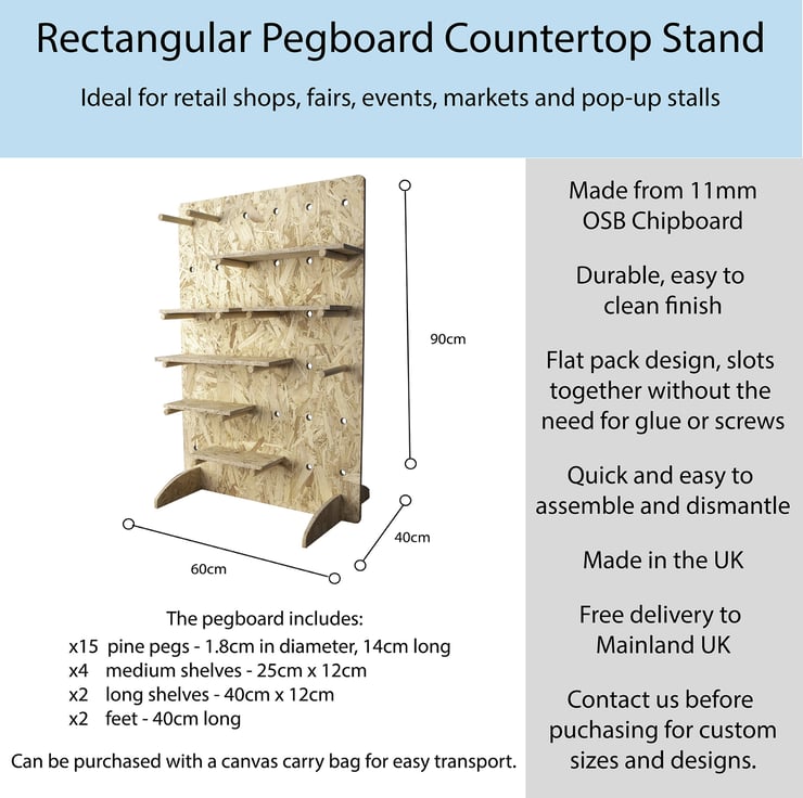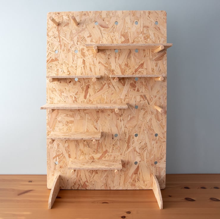 This medium sized OSB pegboard display stand is the perfect size to display your items on a counter top or market stall table. Providing a modern and industrial look and feel to your display area. OSB is very strong and durable. The pegs are made from pine dowels which can be inserted into any of the holes on either side of the pegboard stand. The pegs can be used on their own to hang individual items or used in pairs to hold the included shelving.