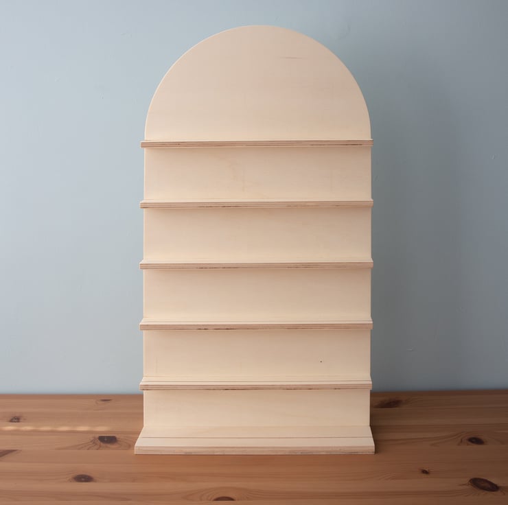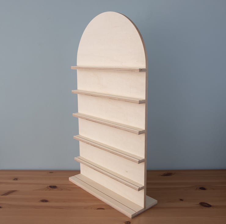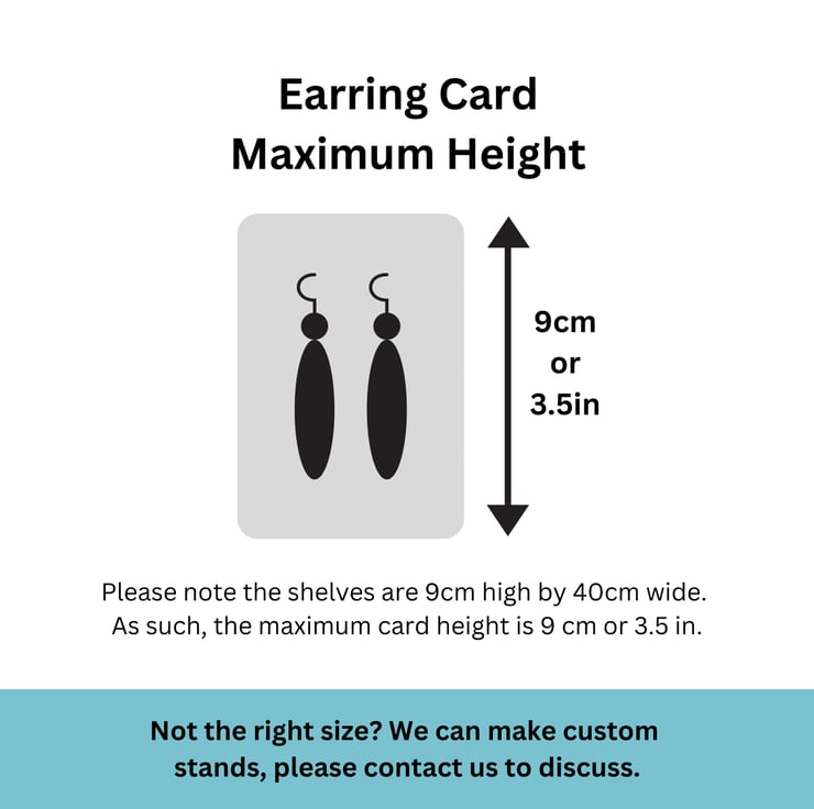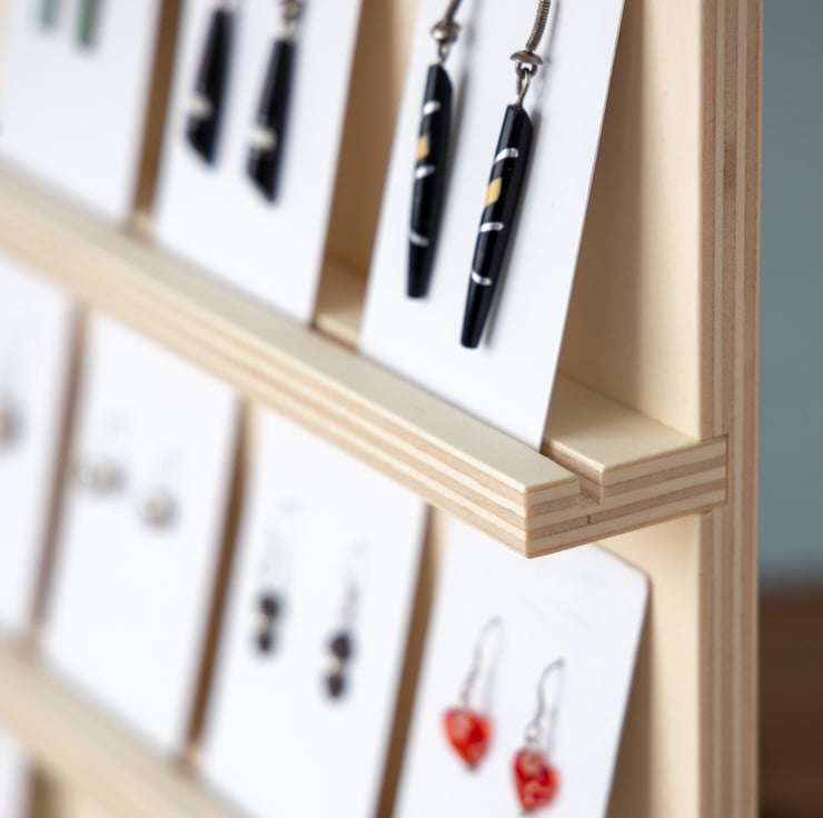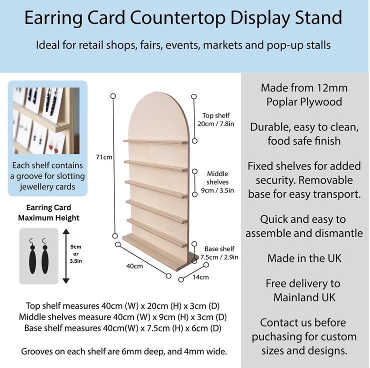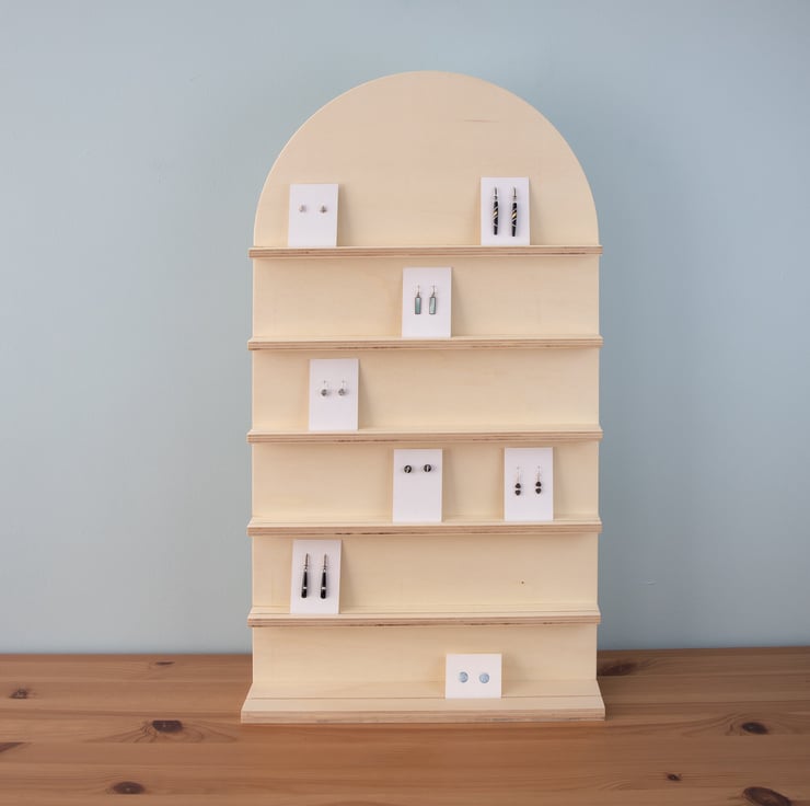 This light and compact earring jewellery display board, with decorative curved top, is handmade from the highest grade 12mm thick Poplar plywood, along with a 15mm thick Poplar plywood base. The shelves are fixed in place for added security, where as the base is removable for easy transport.