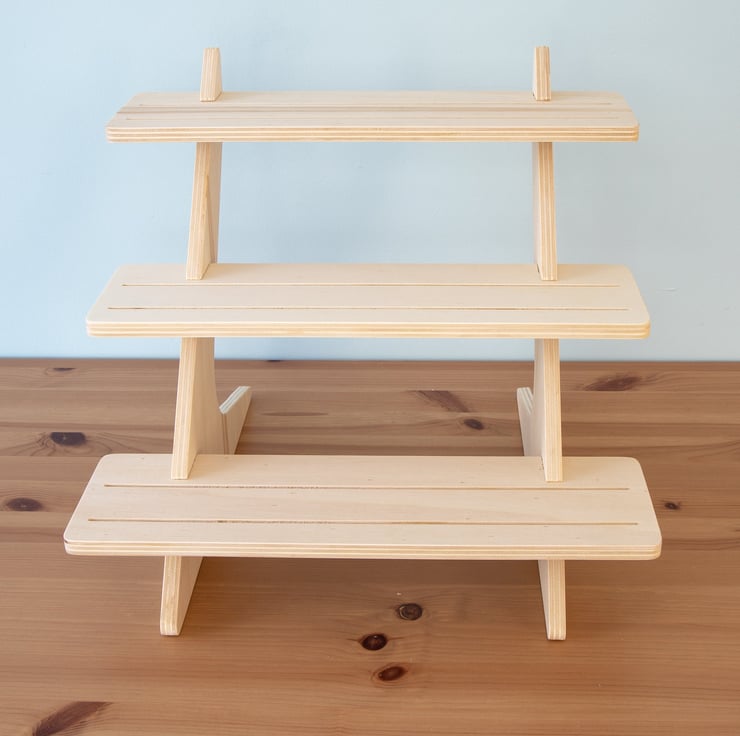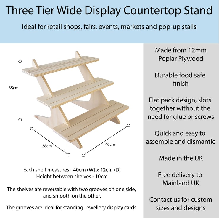 The 3 tier shelving display stand is handmade from the highest grade 12mm thick Poplar plywood. The shelving can withstand a fair amount of weight and are perfect for display your items on a counter top or market stall table.