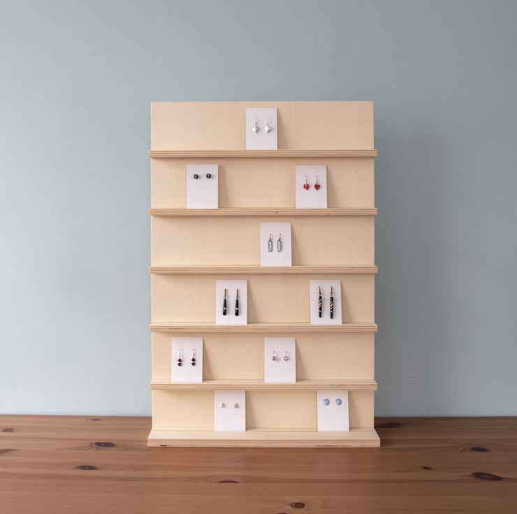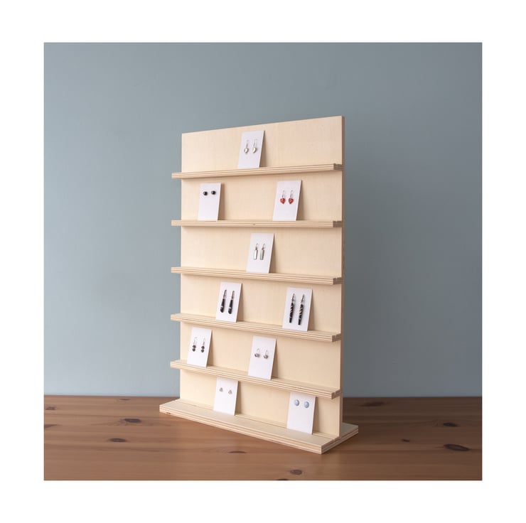 This light and compact earring jewellery display board is handmade from the highest grade 12mm thick Poplar plywood, with a 15mm thick Poplar plywood base. The shelves are fixed in place for added security, where as the base is removable for easy transport.