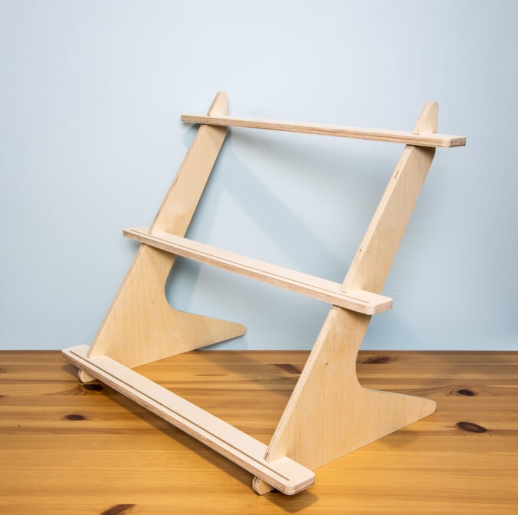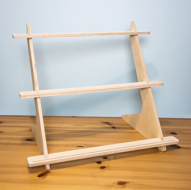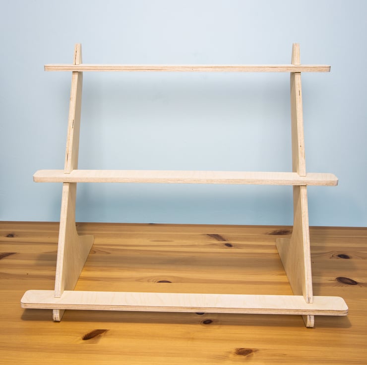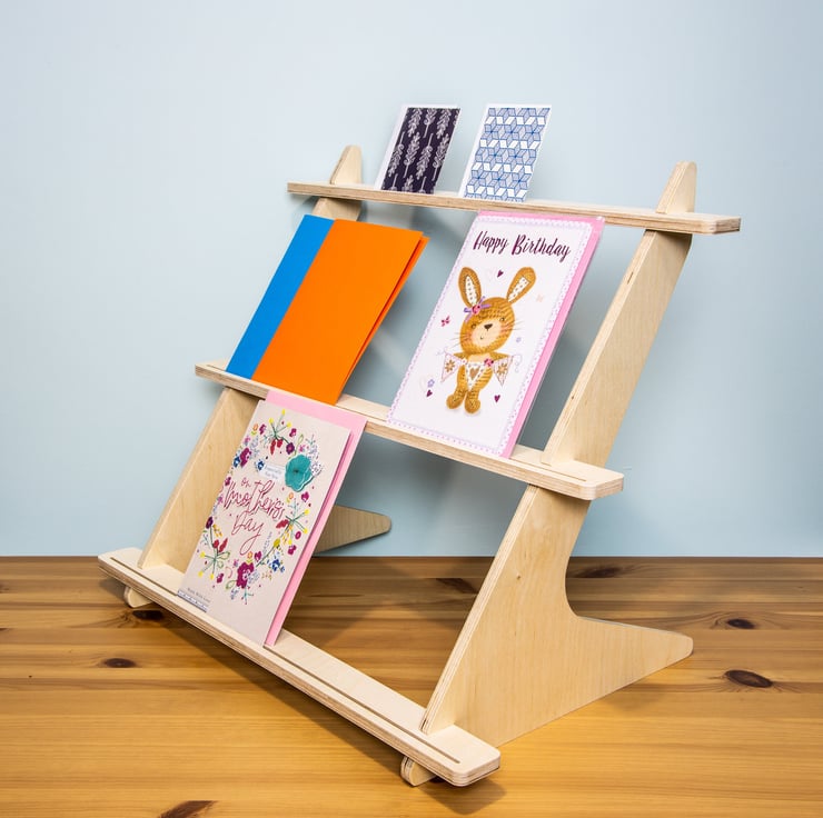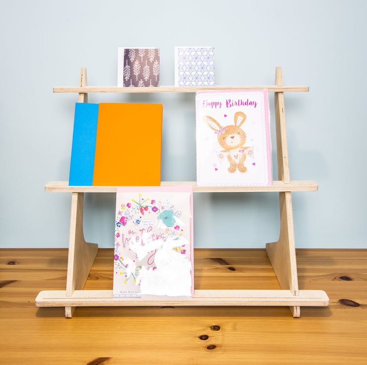 Handmade Tall 3 tier display stand, made to accomodate A5 art prints and greeting cards. With ample room of 20cm between the shelves. This stand is made from 12mm Poplar plywood. This type of wood is strong and light, and is much better quality than standard MDF.