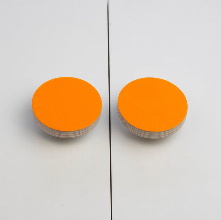 These orange painted door and drawer knobs are made from high quality 24mm birch plywood.