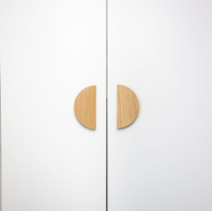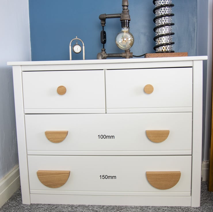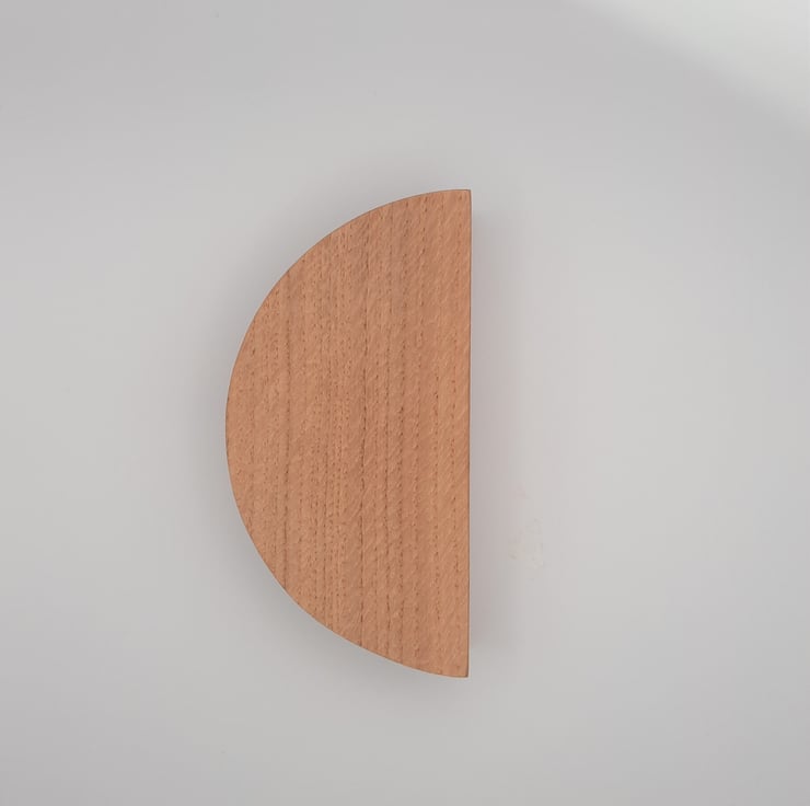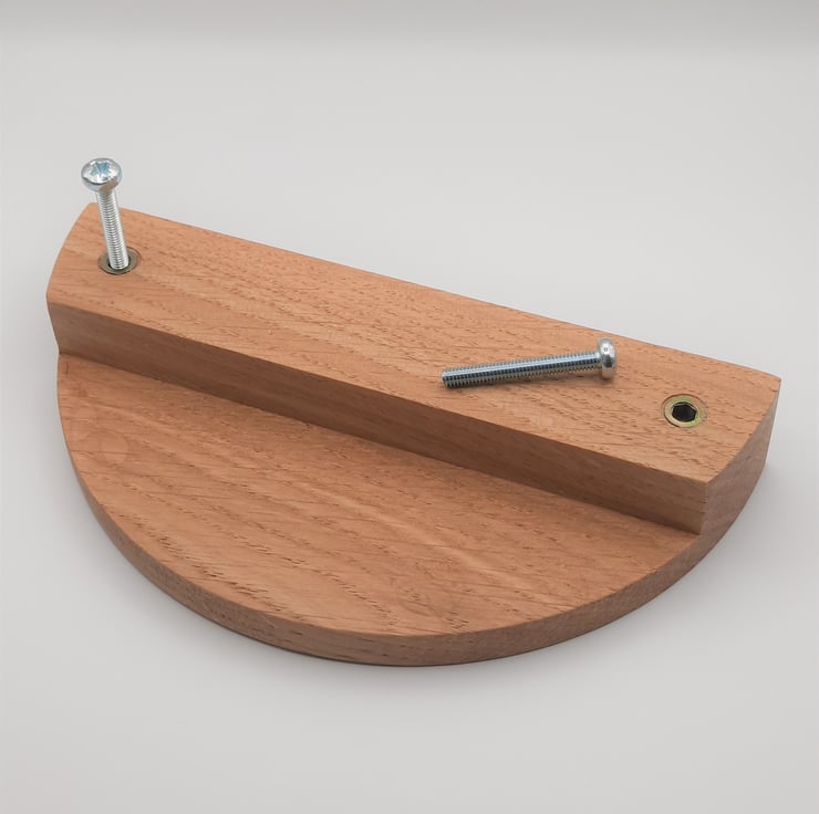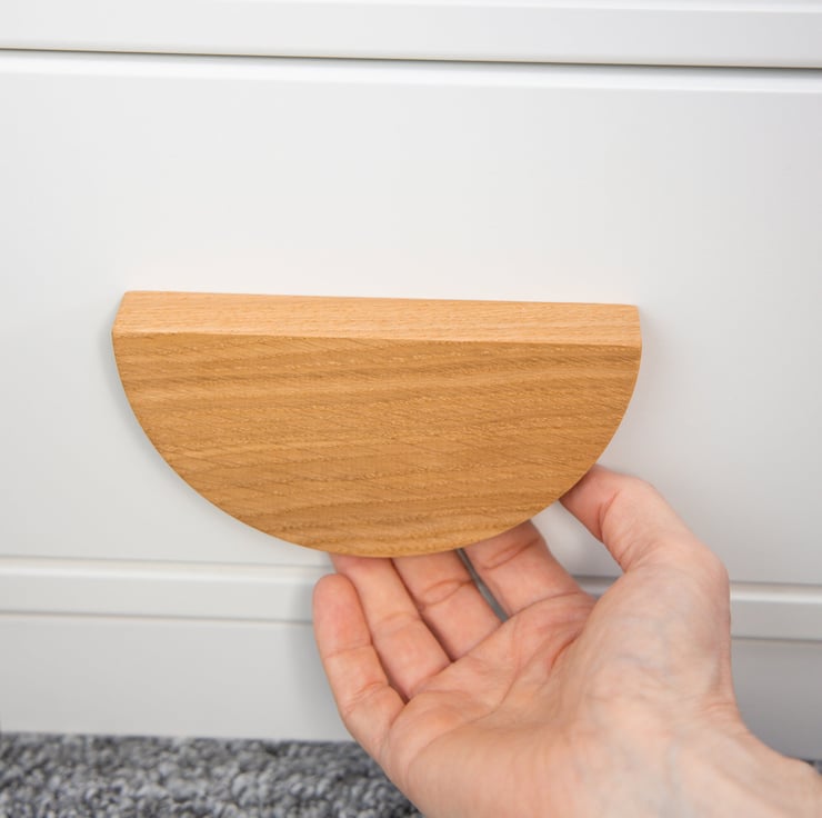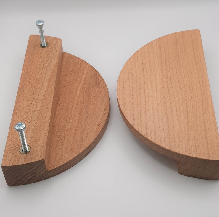 Solid oak semi-circular half moon handle with screw inserts for doors and drawers. The handle is routed from one piece of 25mm thick European oak. No glued parts. Our prime grade planed European Oak is sustainably sourced and kiln-dried.