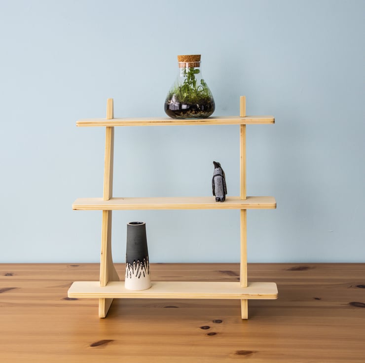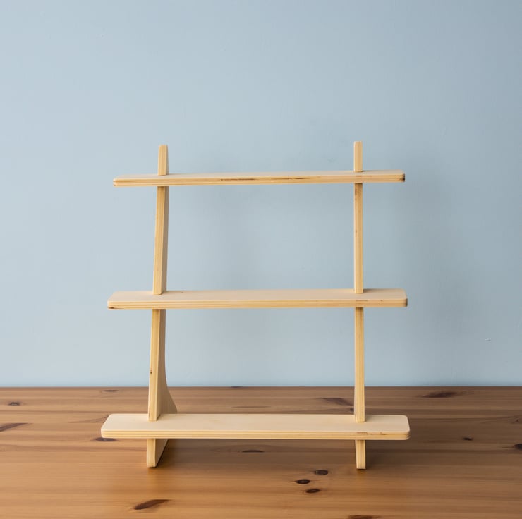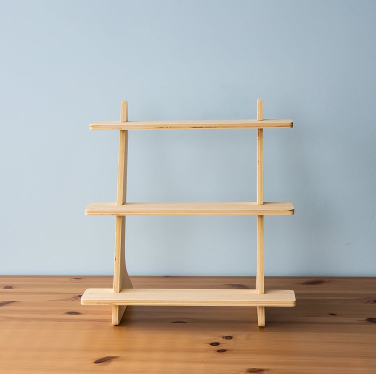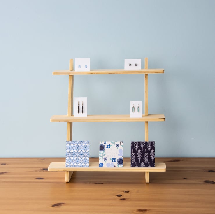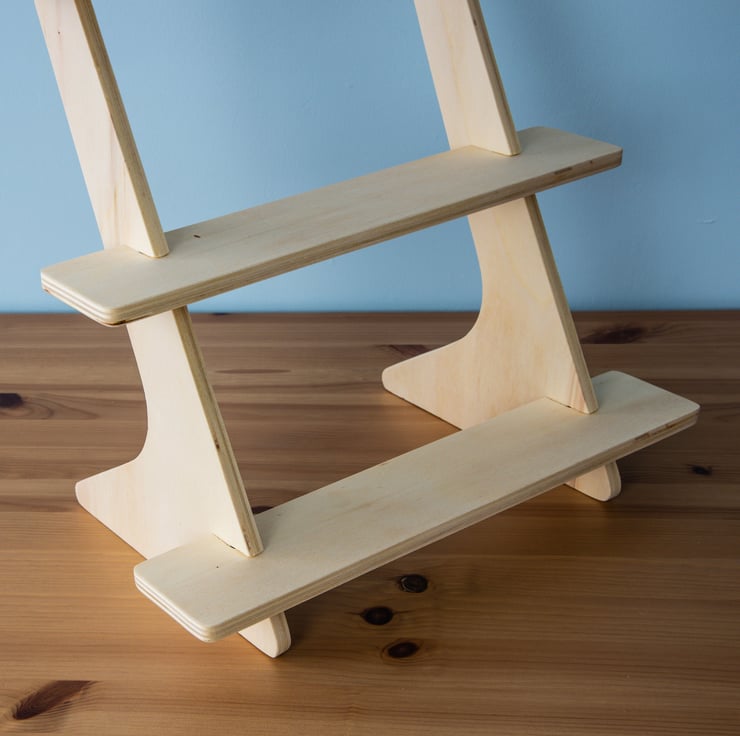 This light and compact multi tier shelf display stand is handmade from the highest grade 12mm thick Poplar plywood. The shelves are reversible - this allows you to use the grooved side to display items such as cards and jewellery for example. The non grooved side can be used to display jams, candles, cupcakes, sweets, or any other items you wish to display to your customers.