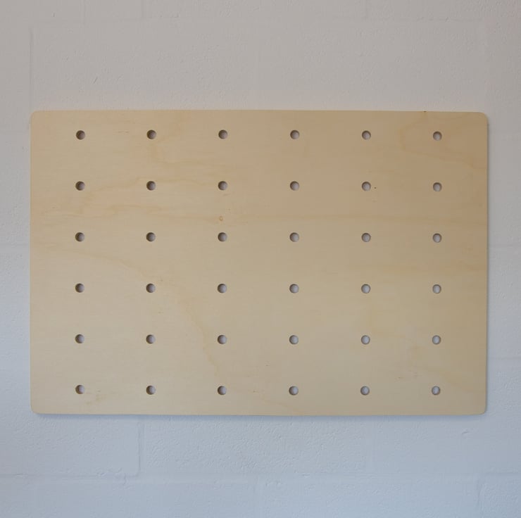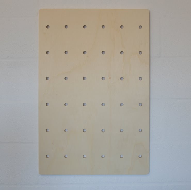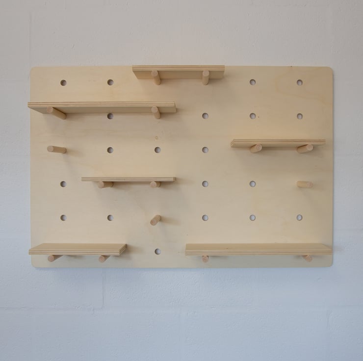 This medium sized wall mounted pegboard is the perfect size to display your items on the wall. Can be mounted portrait and landscape. The pegboard is made from the highest grade 15mm Poplar plywood. The pegs can be used on their own to hang individual items or inserted in pairs to hold the included shelving.