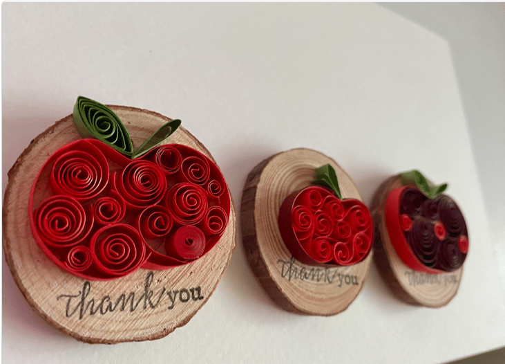 I have handmade these really lovely paper quilling Apple magnets and they are mounted onto woodslices. They are perfect as teacher appreciation gifts to say thank you with a small token