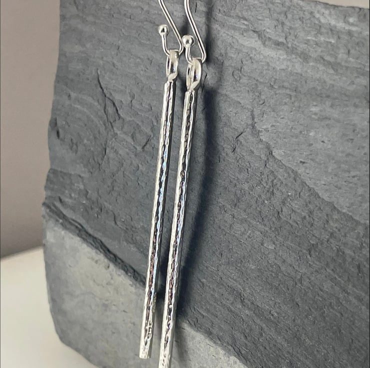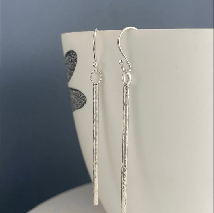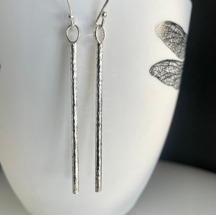 A lovely pair of long round drop-dangle bar earrings handmade from 925 sterling silver. Cut by hand from solid 2mm thick silver round wire and hammered to create their unique attractive sparkly textured surface. They have traditional silver ear wires and are