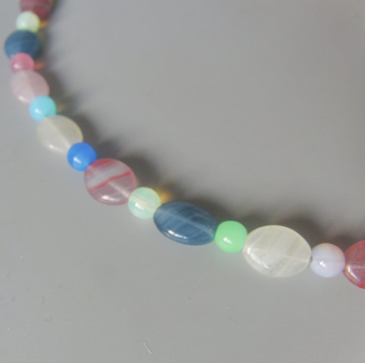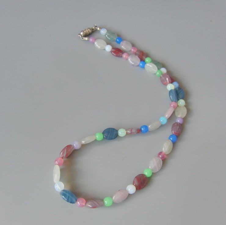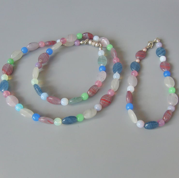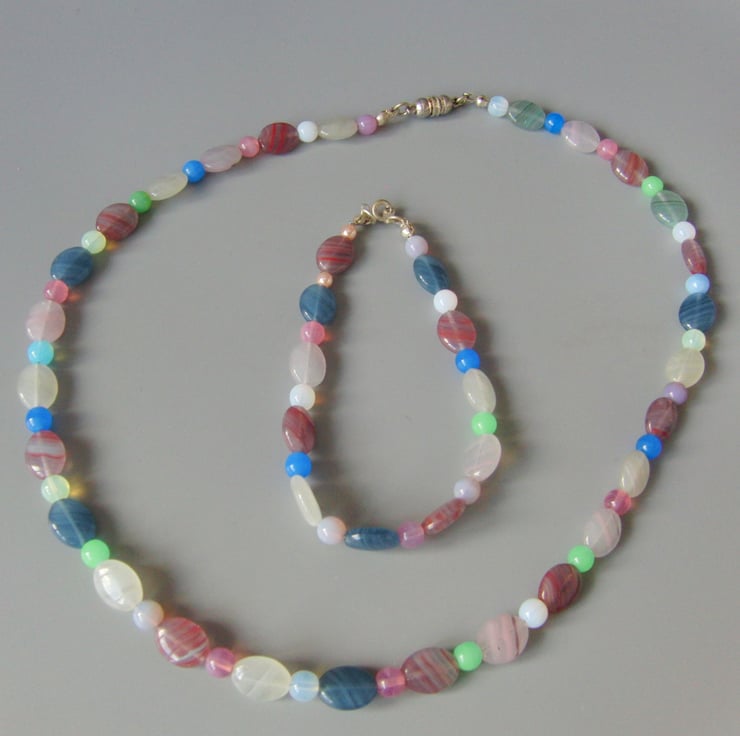 The attractive jewellery set is made using 10mm x 8mm oval opaline beads in blue, pink and clear colours and small, 6 mm, round opaline beads in pink, green, blue and white colours. They both have a silver plated clasps, the necklace clasp is magnetic and the one on the bracelet is a lobster clasp.