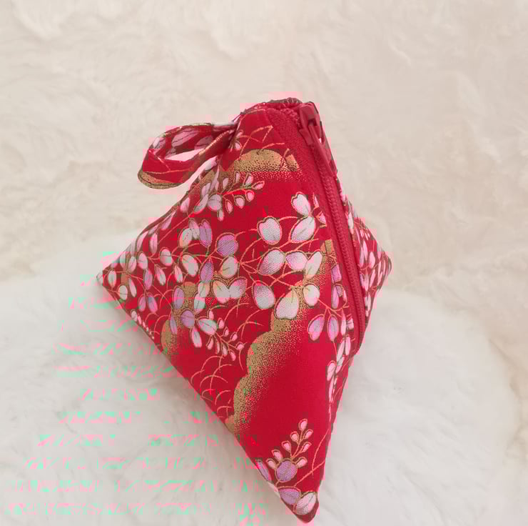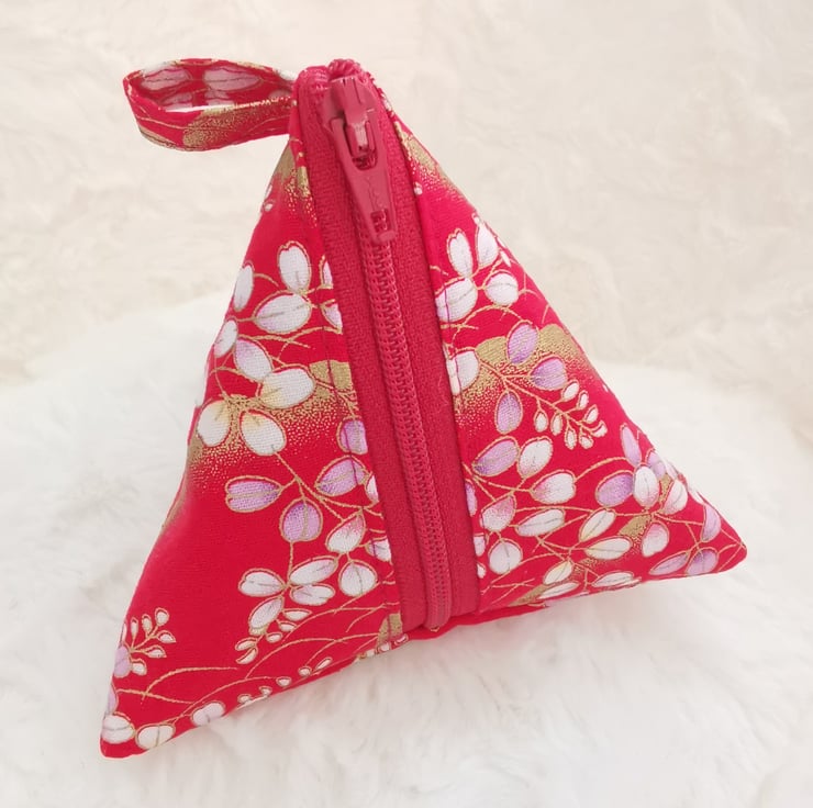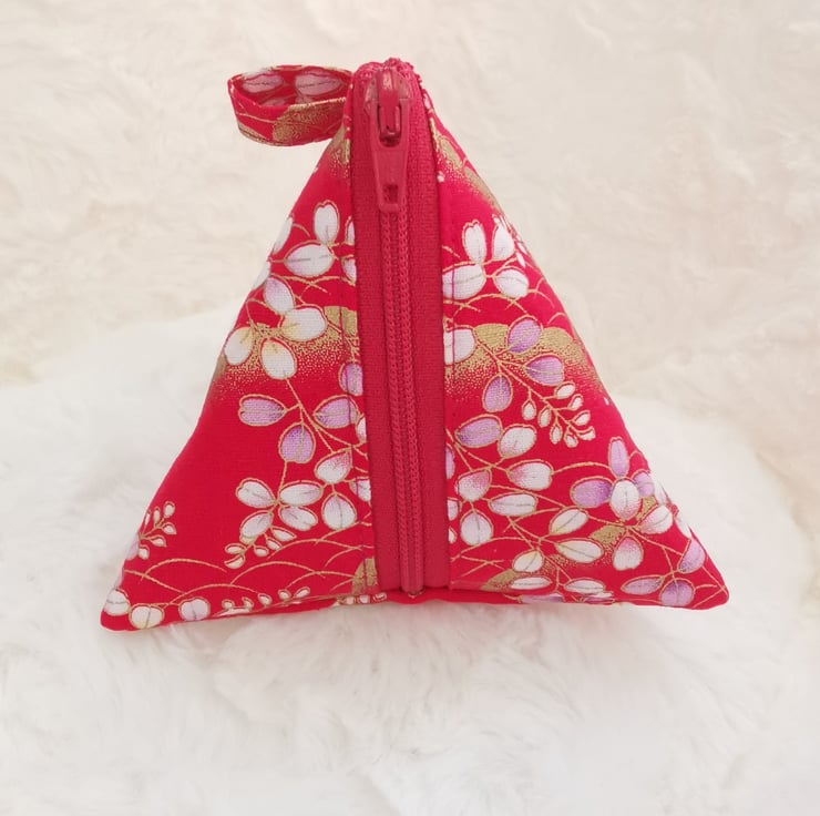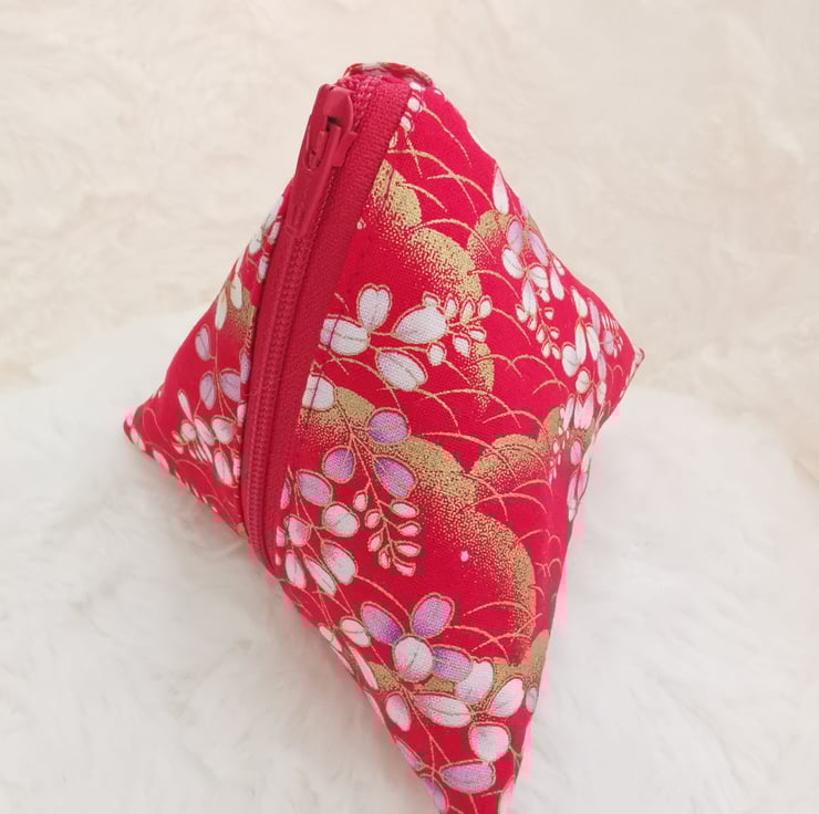 A pyramid shaped purse hand-made using fabric with lining and it features a zipper close up one side.