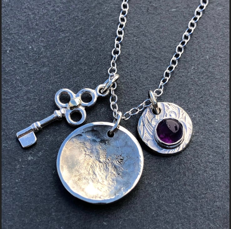 This Amethyst Charm necklace is made from Sterling Silver and 9ct gold. The necklace has three loose charms on a 2.5mm wide, 18” Sterling Silver chain. The silver key has a gold dot detail, the concave cup shaped, the largest charm has melted 9ct gold detail and the amethyst charm has a classic floral design.