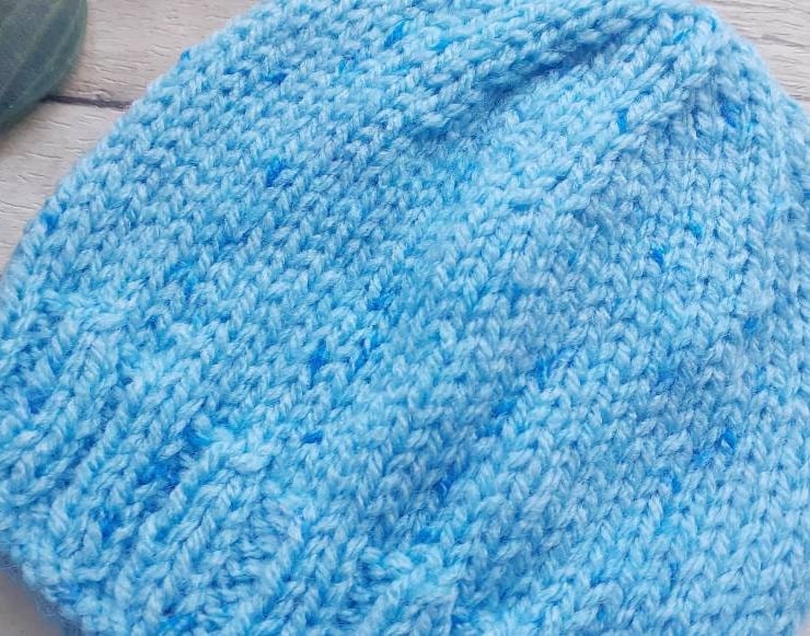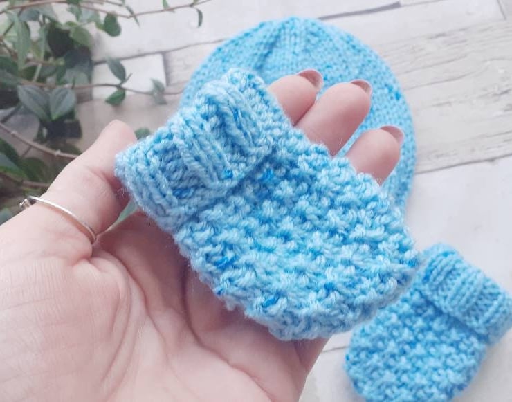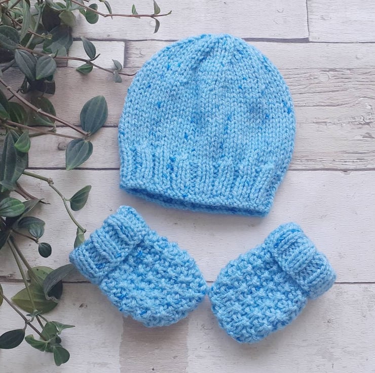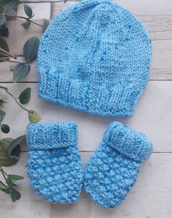 Very soft and stretchy hand knitted baby hat and mittens that is machine washable.