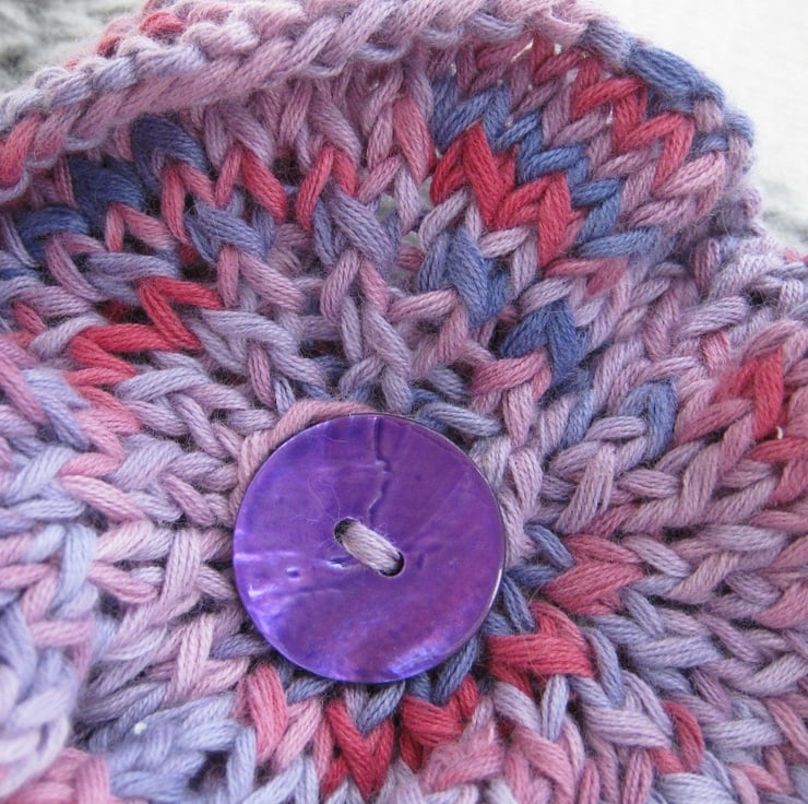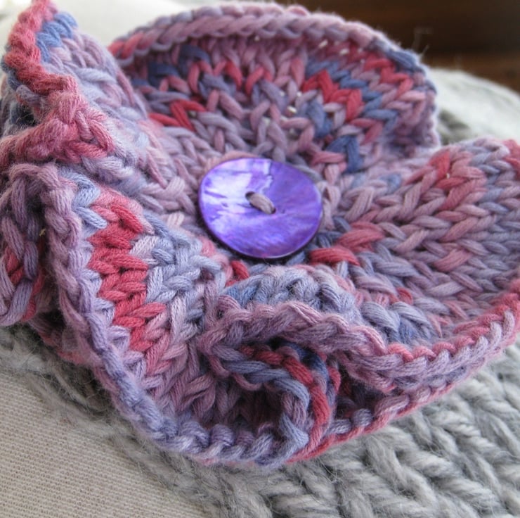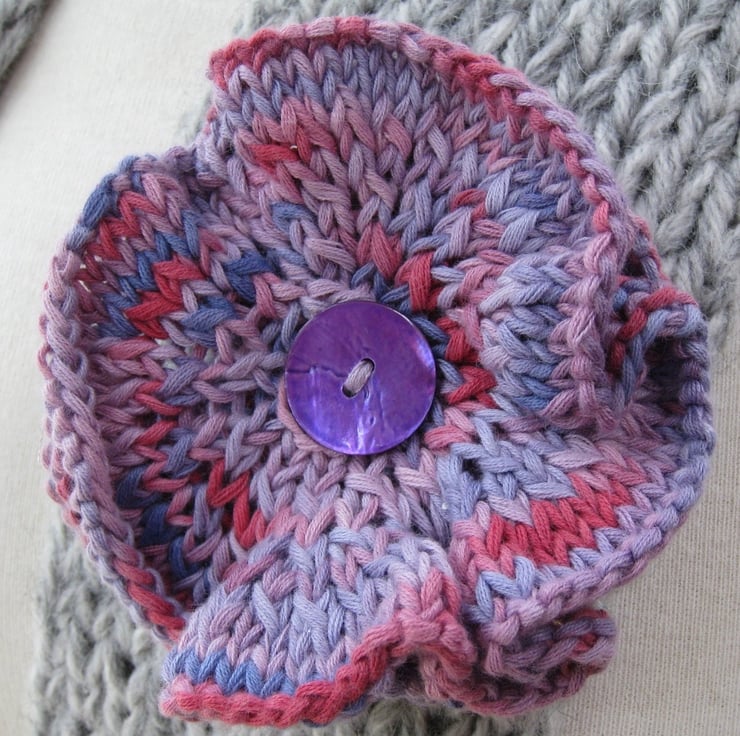 Soft and floppy flower brooch, hand knitted from a scrap of space-dyed cotton yarn of pastel shades of lilac and pink, finished with a glossy bright purple shell button.