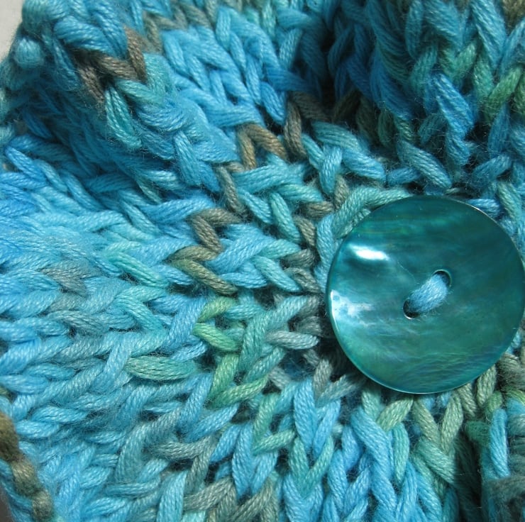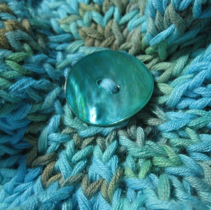 Soft and floppy flower brooch, hand knitted from a scrap of space-dyed cotton yarn in shades of turquoise, aqua and green finished with a glossy turquoise shell button.